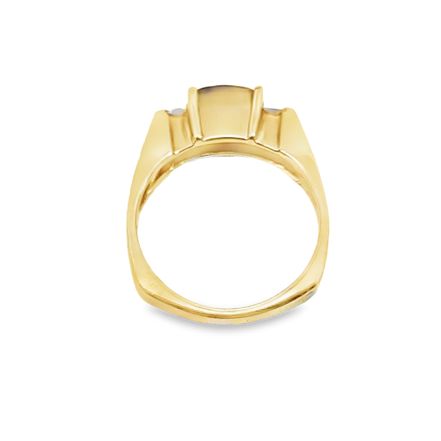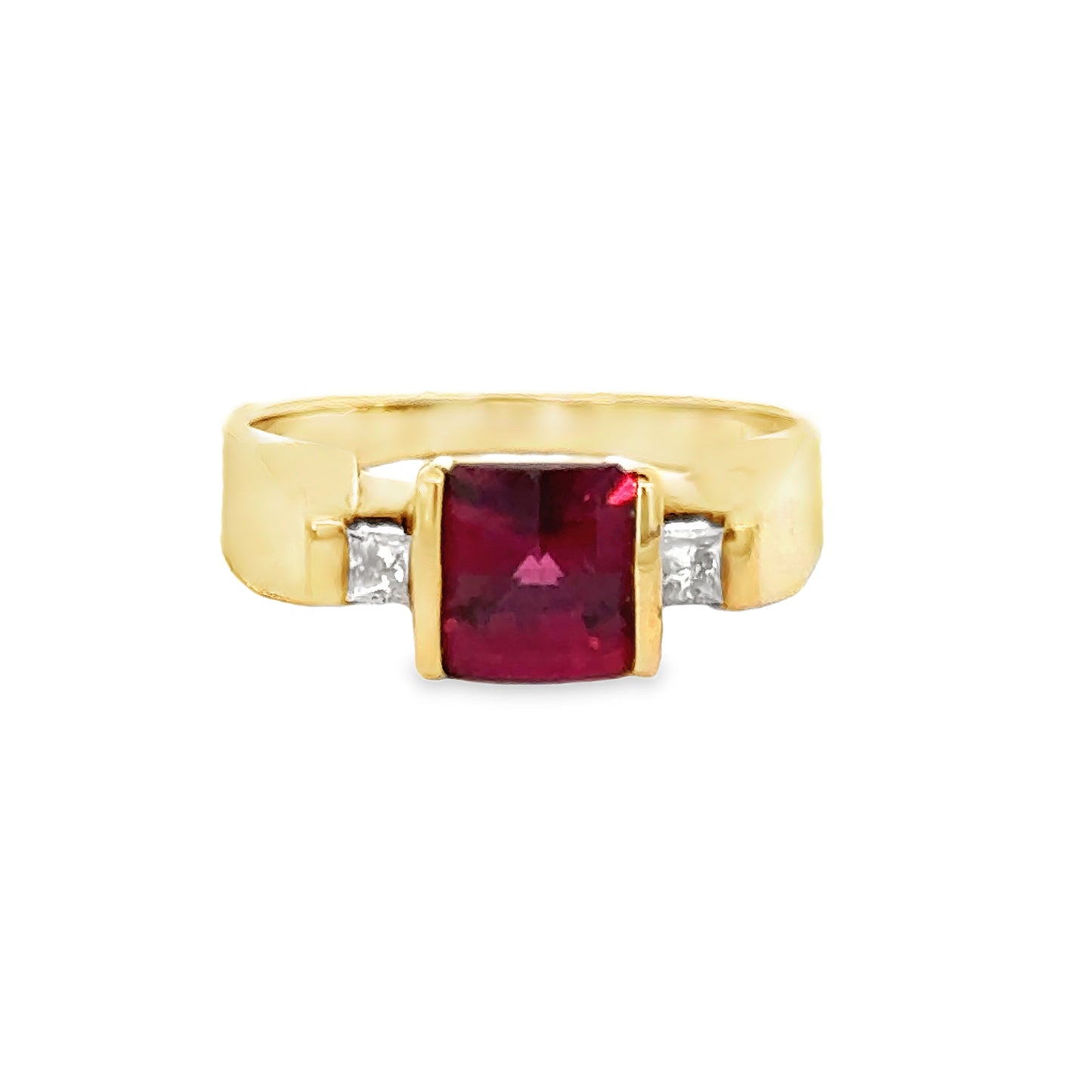 This vintage 1990's 14k yellow gold ruby and diamond ring is a striking statement piece. The deep red, square-cut ruby takes center stage, flanked by two sparkling diamonds that add an extra touch of elegance. The band features strong angular shapes, which give the ring a bold, architectural feel. The warm hue of the gold complements the vivid color of the ruby, making this ring a perfect blend of vintage charm and modern edge. It’s a unique piece for anyone who appreciates distinct design and a luxurious look.