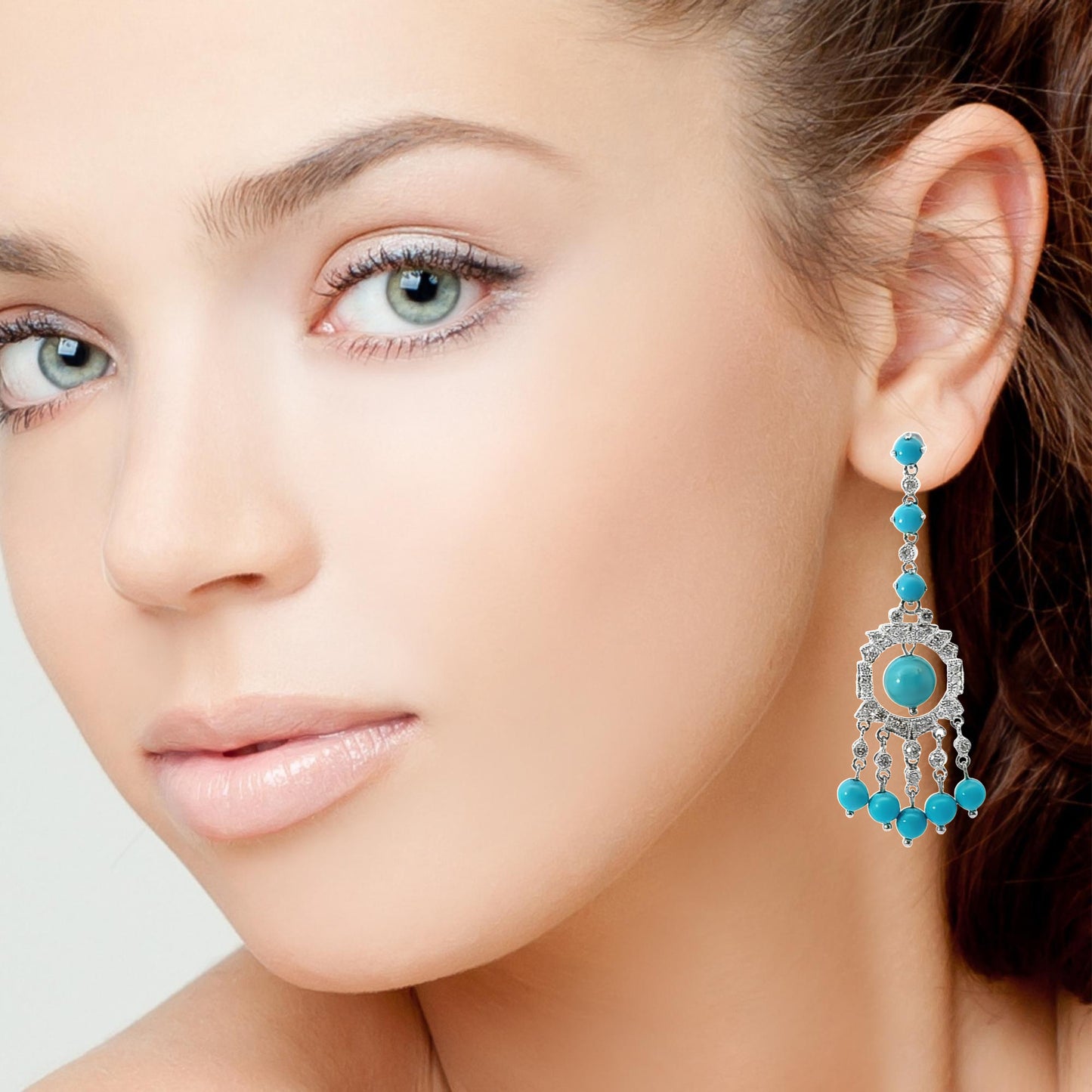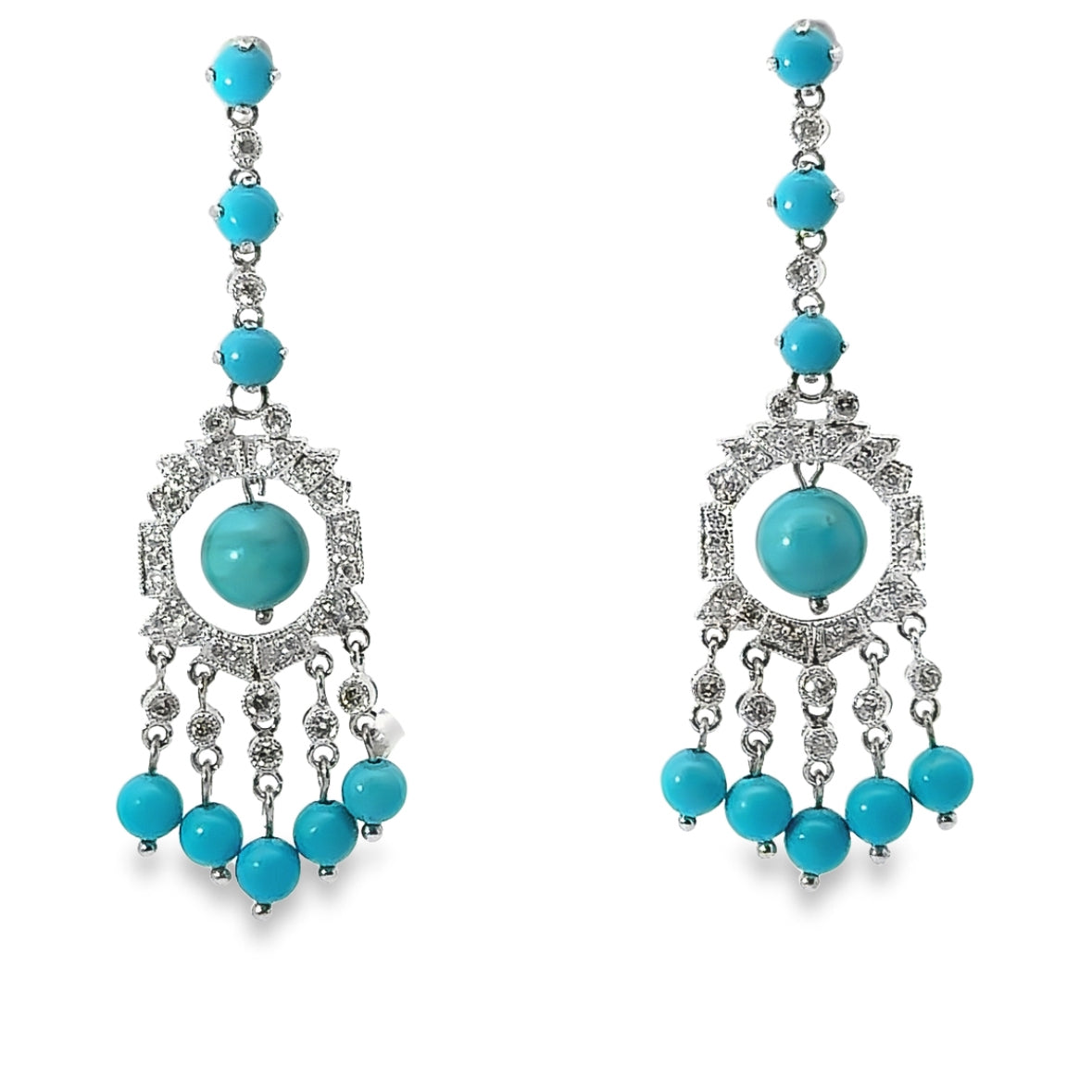 Elevate your style with these stunning 14K white gold turquoise and diamond dangle earrings. The vibrant blue turquoise stones are beautifully contrasted by the sparkling diamonds, creating a captivating and luxurious look. The diamonds are expertly set to allow for maximum light reflection, making them glow with every movement.