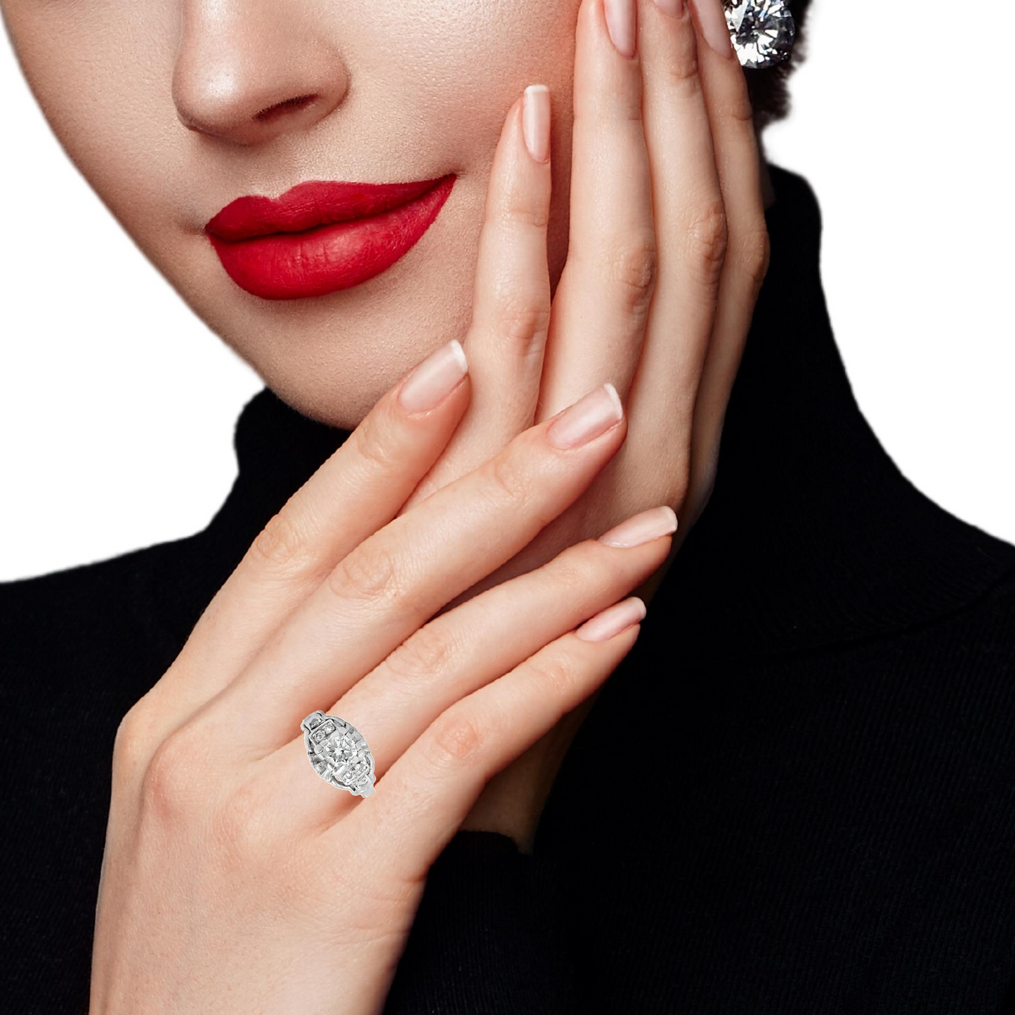 Antique platinum engagement ring is a delightful treasure for any vintage jewelry connoisseur. The ring features a central round diamond, elegantly set in a secure, raised prong setting that highlights its brilliance. Flanking the central diamond on either side are smaller accent diamonds, set within a detailed, geometric design that adds a touch of sophistication and timeless charm. The platinum band is both sturdy and refined, providing a perfect backdrop for the sparkling diamonds. The overall design reflects the craftsmanship of a bygone era, making this ring not only a symbol of enduring love but also a piece of history that would be cherished by anyone with an appreciation for vintage jewelry.