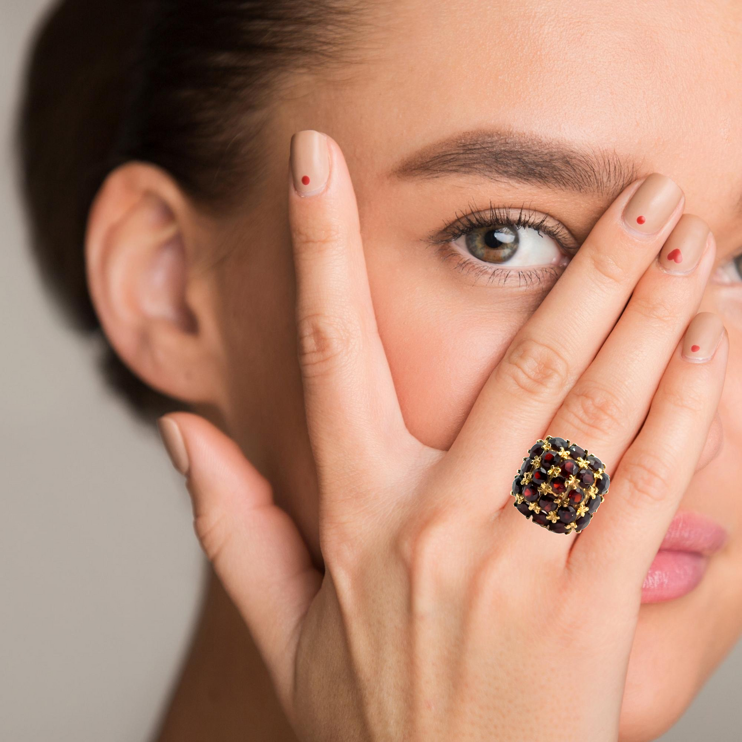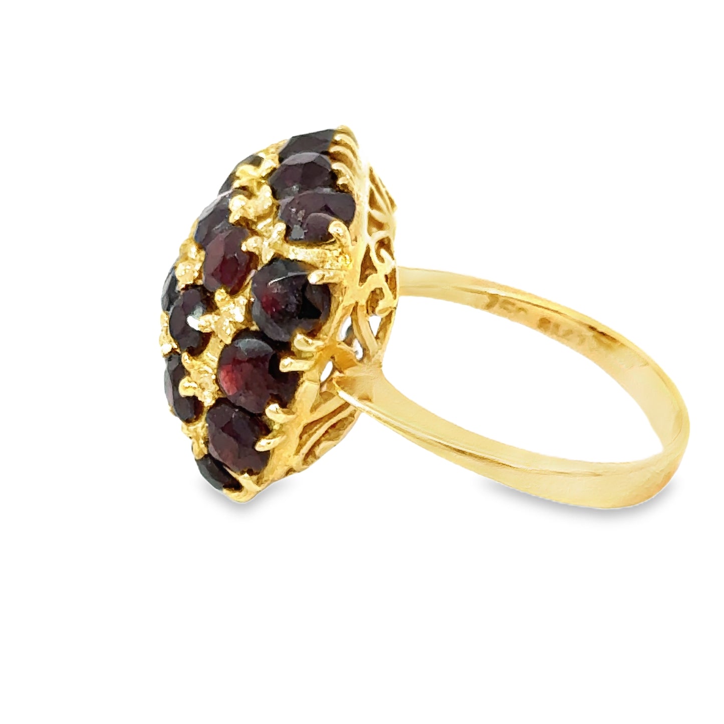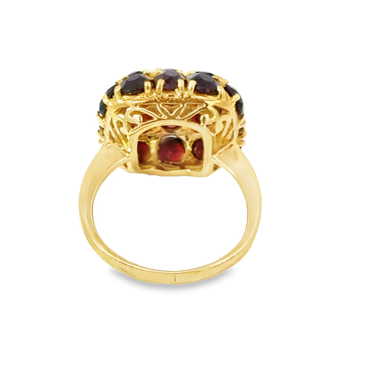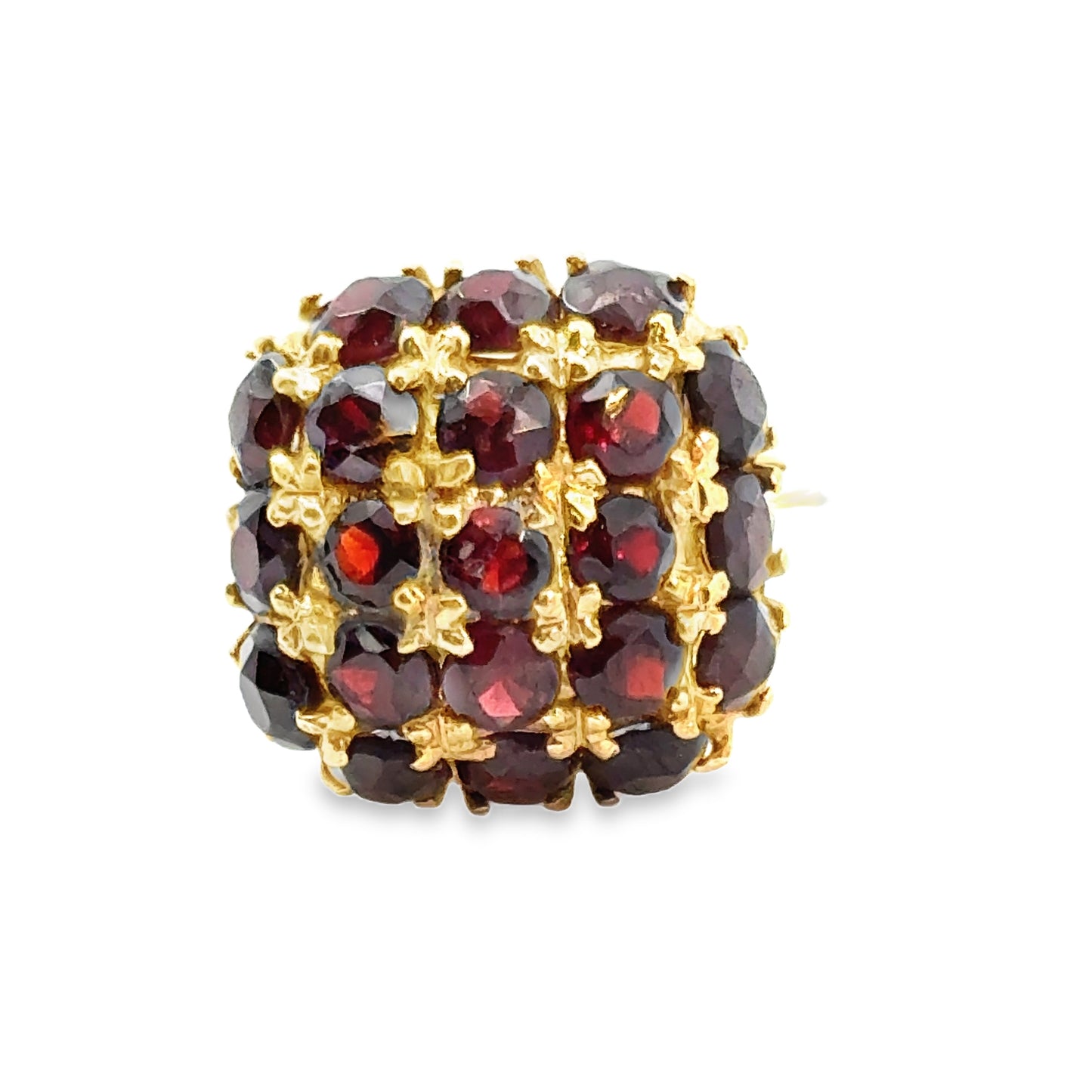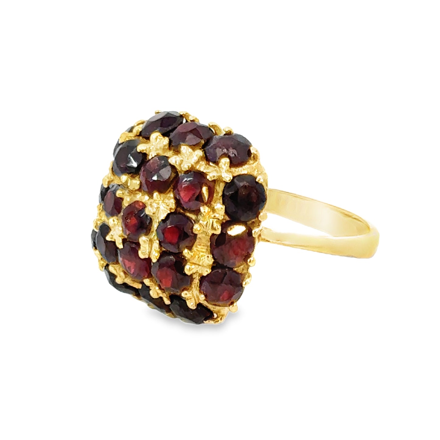 The rich yellow gold band complements the vibrant garnets perfectly, adding warmth and sophistication to the piece. The filigree work beneath the cluster showcases intricate detailing, further emphasizing the ring's craftsmanship and artistic design. The dome shape of the garnet cluster ensures that this ring stands out, making it a true statement piece that you won't be able to stop admiring. Its unique design and vintage appeal make it a timeless addition to any collection, offering both beauty and history in one luxurious package.