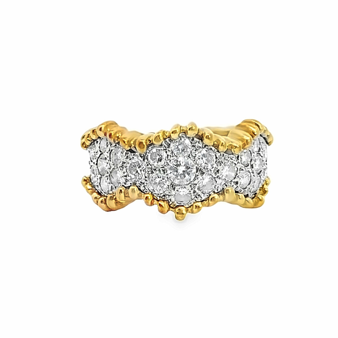 Discover this beautiful, charming diamond ring with brilliant cut pave-set diamonds presenting a trio of adjacent diamond flowers. The detail of the yellow gold stitching is exquisite as it gracefully wraps around your finger in a wave pattern. The visual appearance of this beautiful estate piece commands admiration.