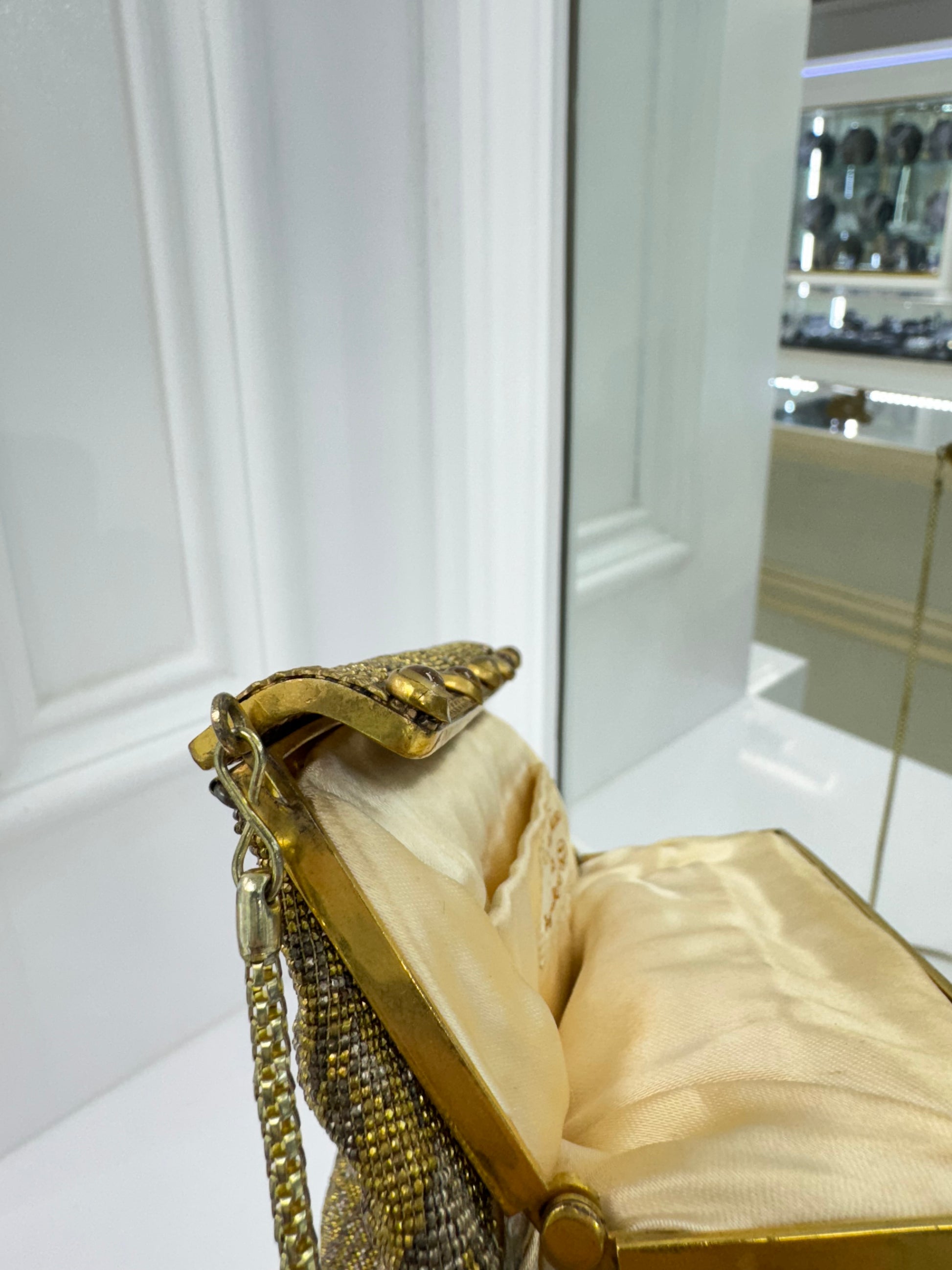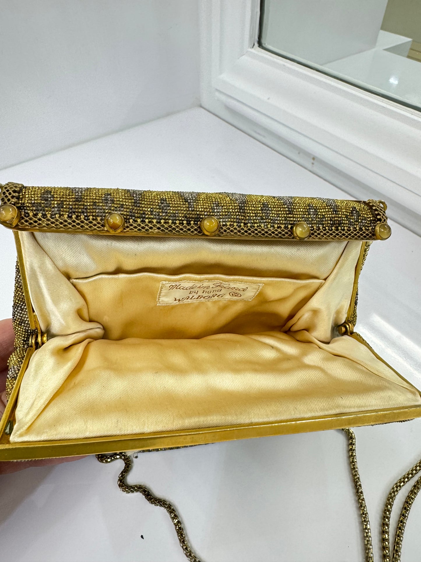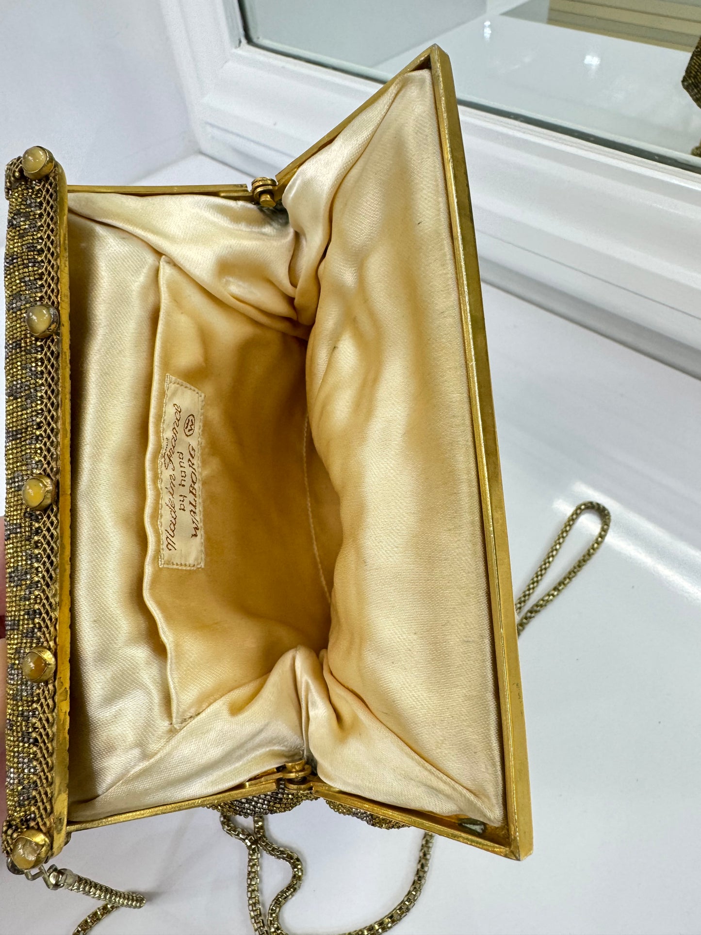 This bag features a gold-tone woven box chain shoulder strap and a cream satin interior with a stitched "Made in France by hand - Walborg" label. The top clasp opens to a single lined compartment, perfect for essentials. A sophisticated accessory for collectors or vintage fashion enthusiasts, this piece beautifully showcases the charm and artistry of the 1900s.