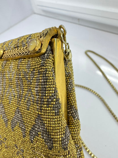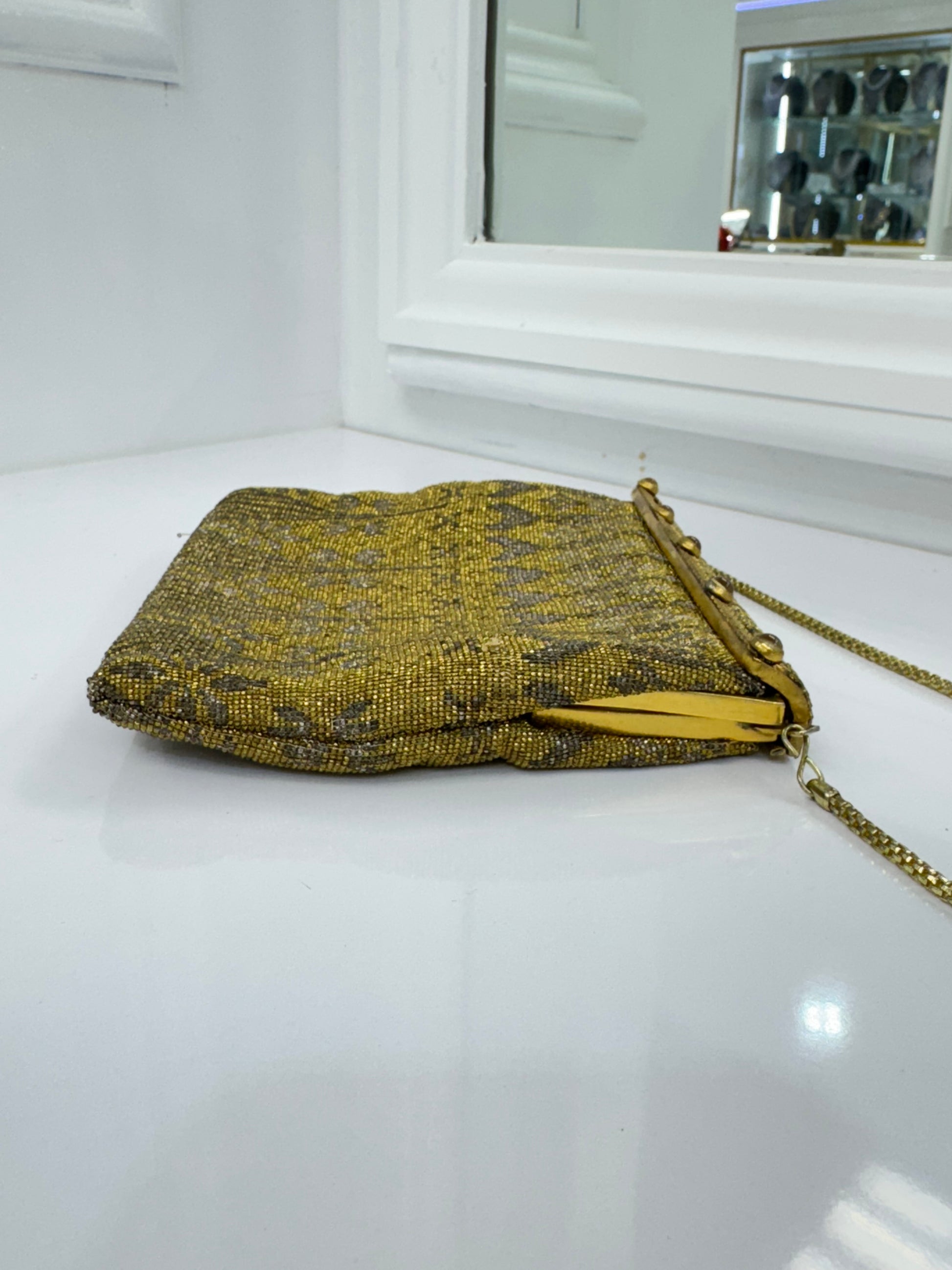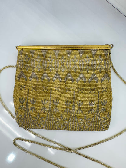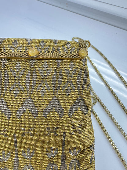 A rare and exquisite vintage find, this Walborg evening bag is a stunning example of early 20th-century craftsmanship. Handmade in France, the bag is fully adorned with intricate gold and silver-toned micro-beading in an elegant floral and geometric pattern. The structured frame is accented with five tiger's eye-style cabochon buttons and a delicate lattice overlay, adding a unique and luxurious touch.