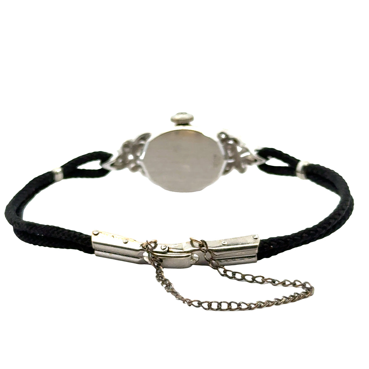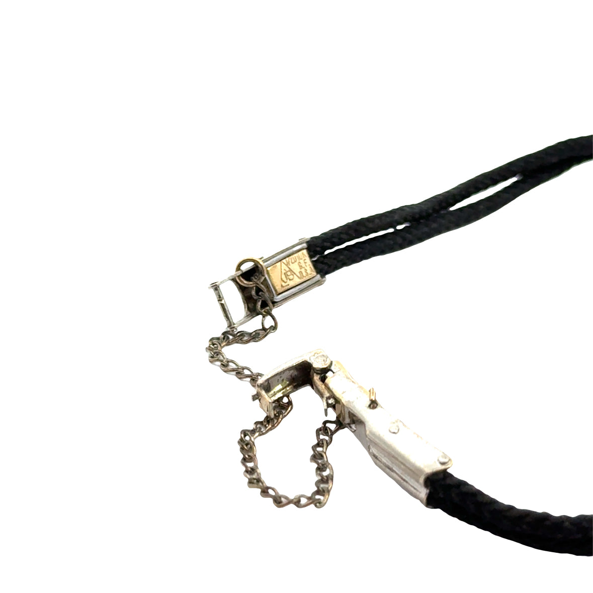 The petite 14mm round face showcases original Deco-style triangular hour markers and a faceted crystal, adding dimensional brilliance and vintage charm. Paired with its black braided cord bracelet and safety chain, this heirloom piece offers both delicacy and timeless sophistication.