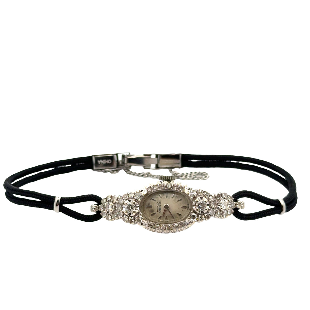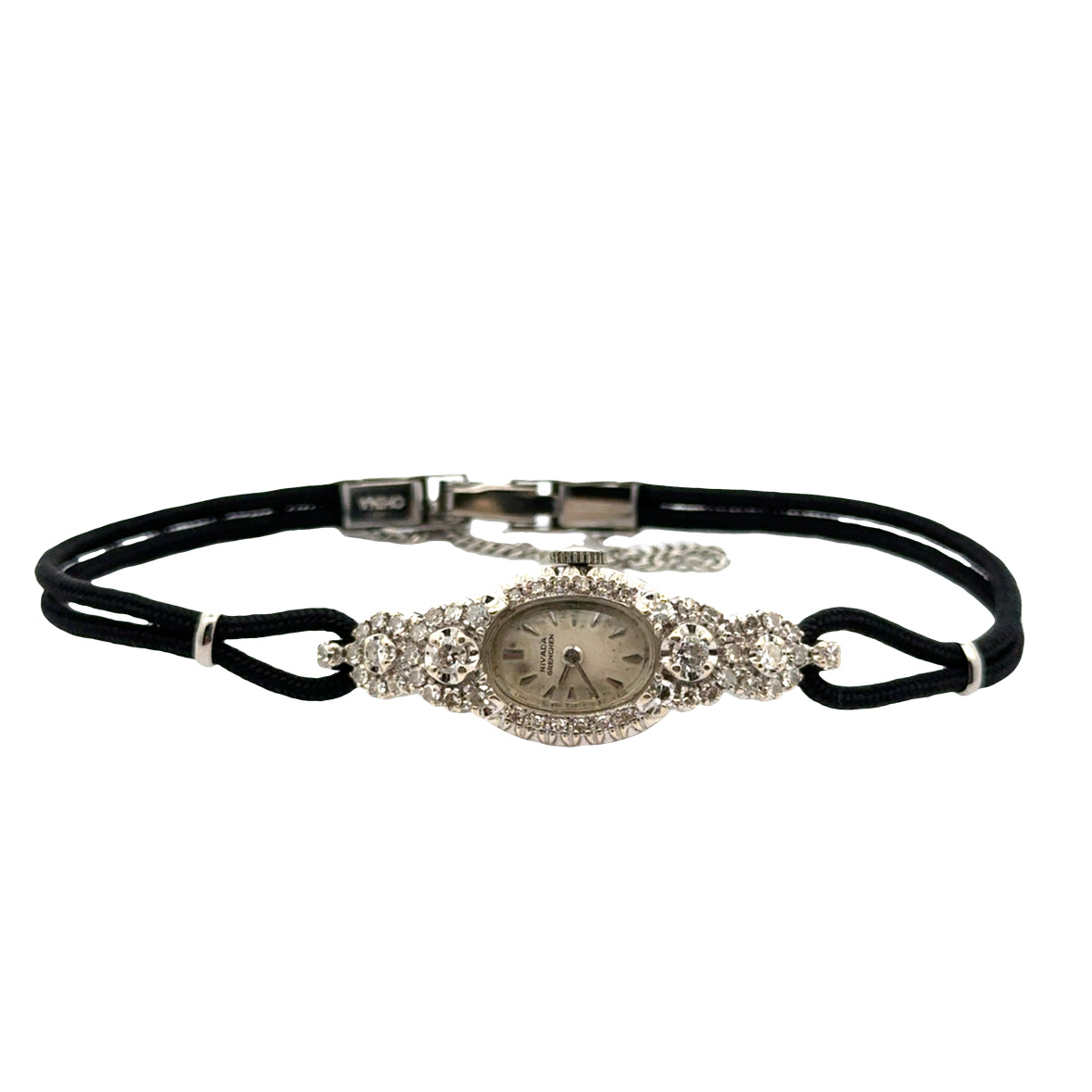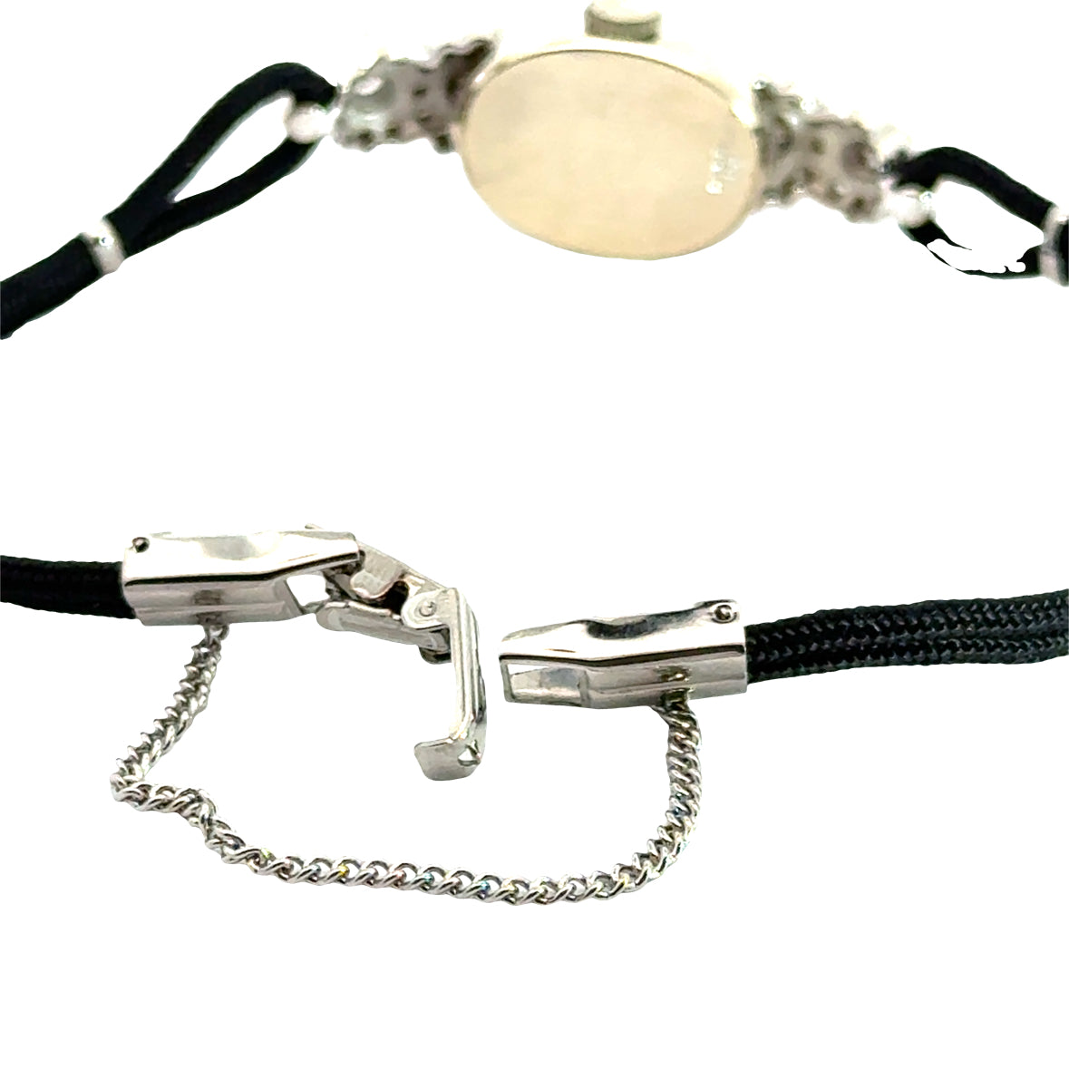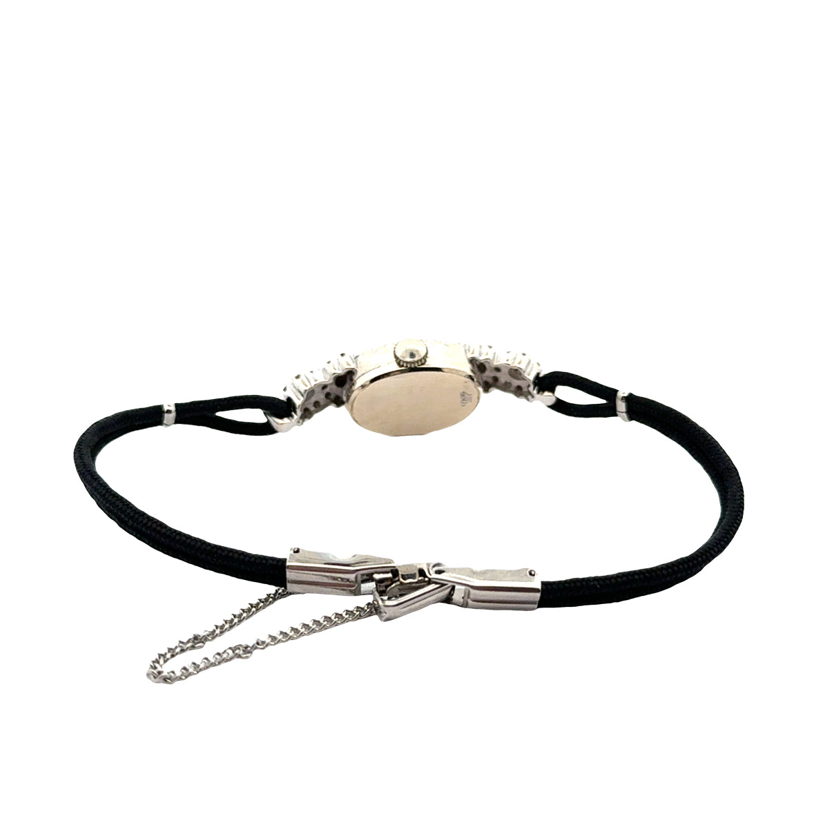 The watch has been newly fitted with a fresh black double-rope cord bracelet and a new clasp with safety chain, offering both comfort and modern security while preserving the vintage character. Perfect as an heirloom accessory, a bridal gift, or a timeless evening piece.