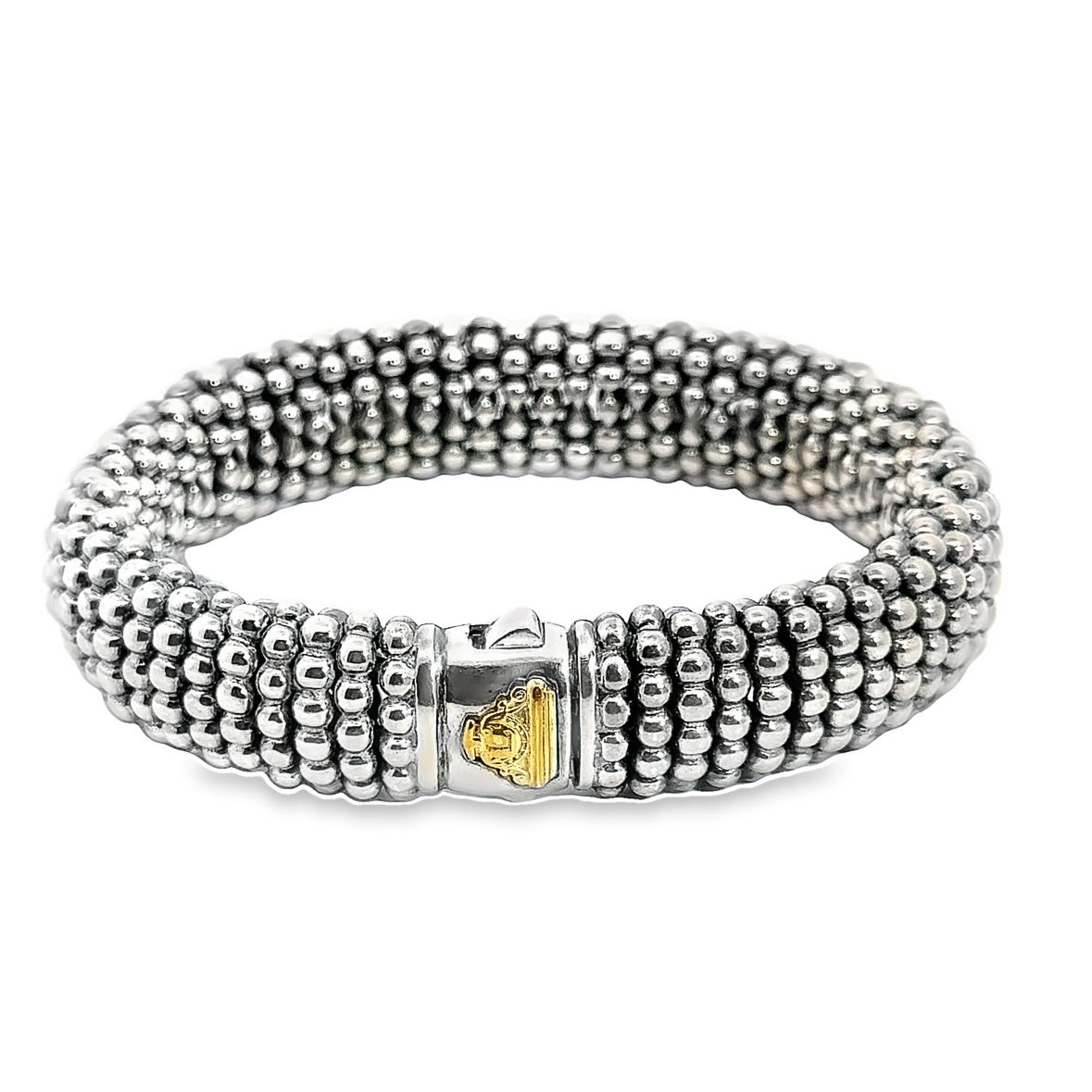 Bubbling silver adds reflective dimensions and signature handiwork in this Lagos bracelet. Comfortable oval with a gold-accented clasp.