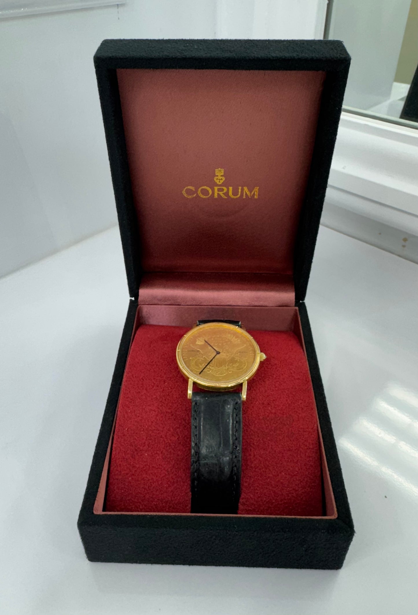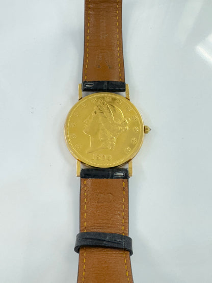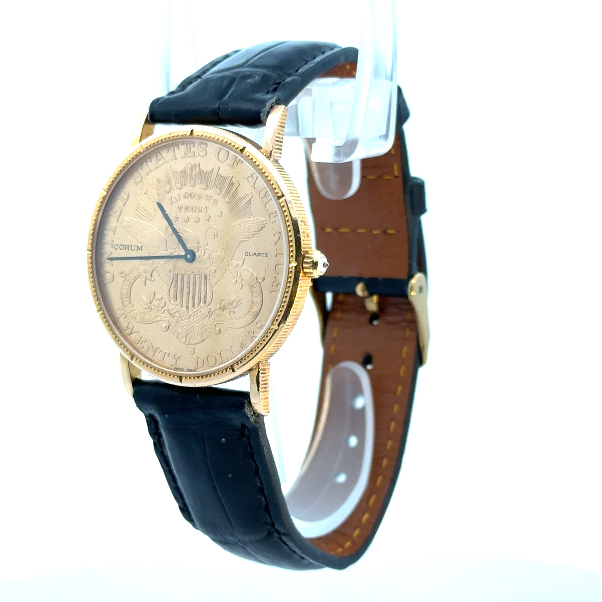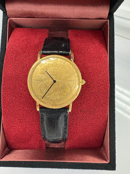 Corum $20 Gold piece (22K gold), case 18k gold, quartz movement, 35mm, coin-22K, black alligator strap, original box |