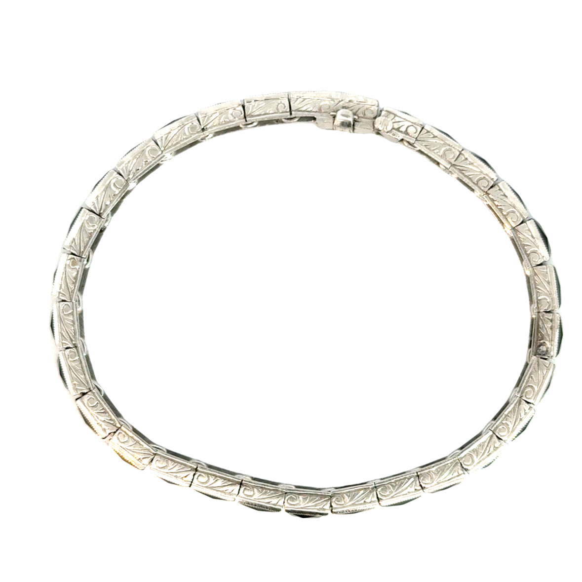 The clasp is integrated into the design, maintaining the bracelet’s refined aesthetic while ensuring a secure fit. The bracelet’s articulation allows it to sit comfortably on the wrist, making it both a luxurious and wearable piece of antique jewelry. This bracelet is a timeless representation of 1920s craftsmanship, elegance, and sophistication.