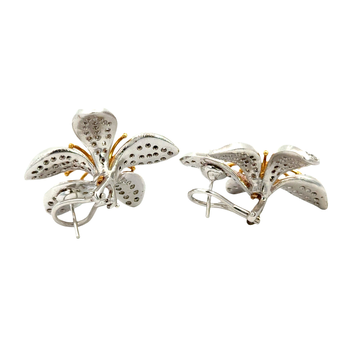 Radiant and refined, these 14K white gold diamond flower earrings are beautifully crafted with shimmering pavé-set white diamonds forming sculpted petals around vibrant yellow diamond centers. The contrast between the cool white gold petals and warm yellow gold prongs creates depth, dimension, and exceptional sparkle. Designed with a classic French-clip closure, these earrings sit comfortably and securely on the ear, offering graceful movement and a striking floral silhouette. A timeless and feminine statement, perfect for both elegant daytime wear and special evening occasions.