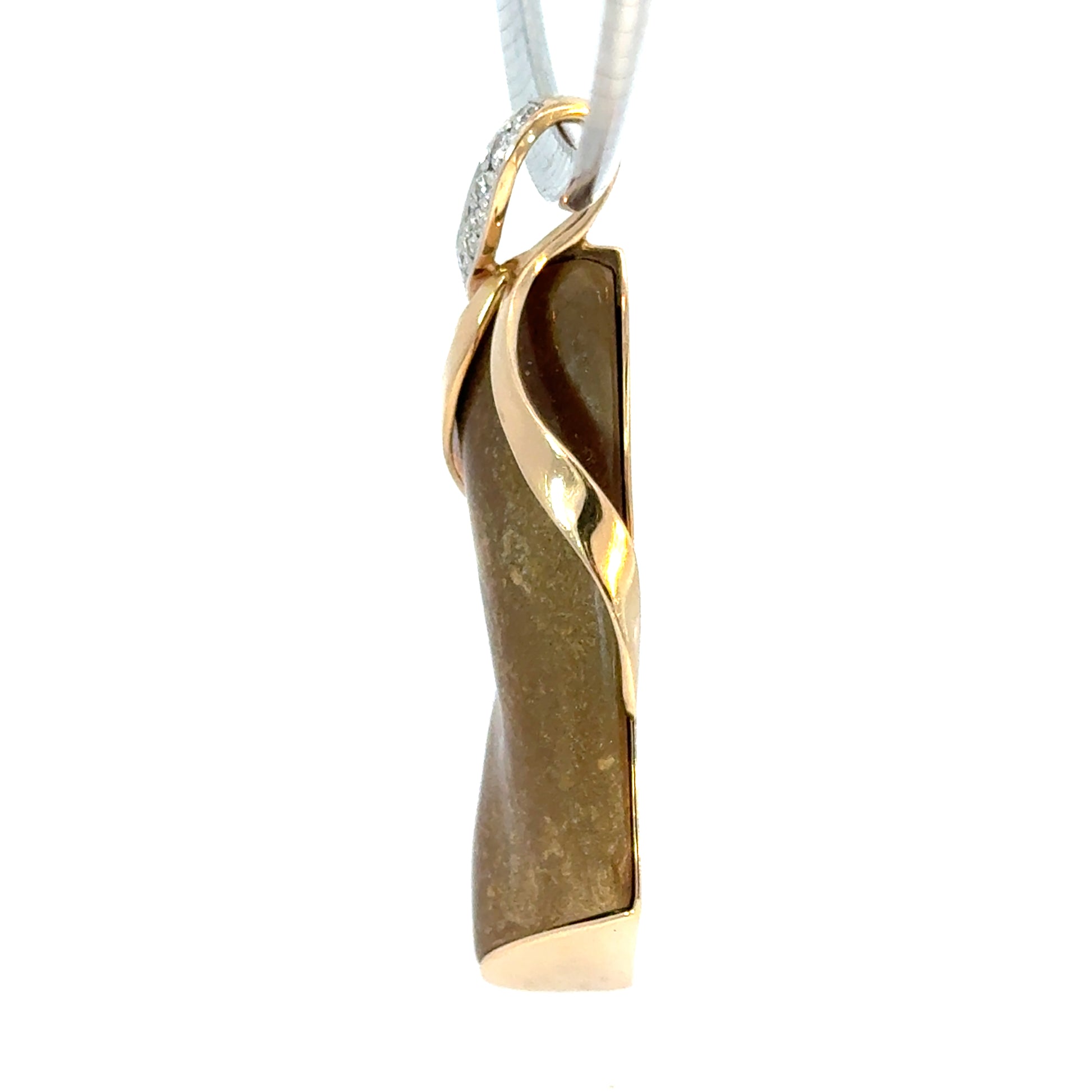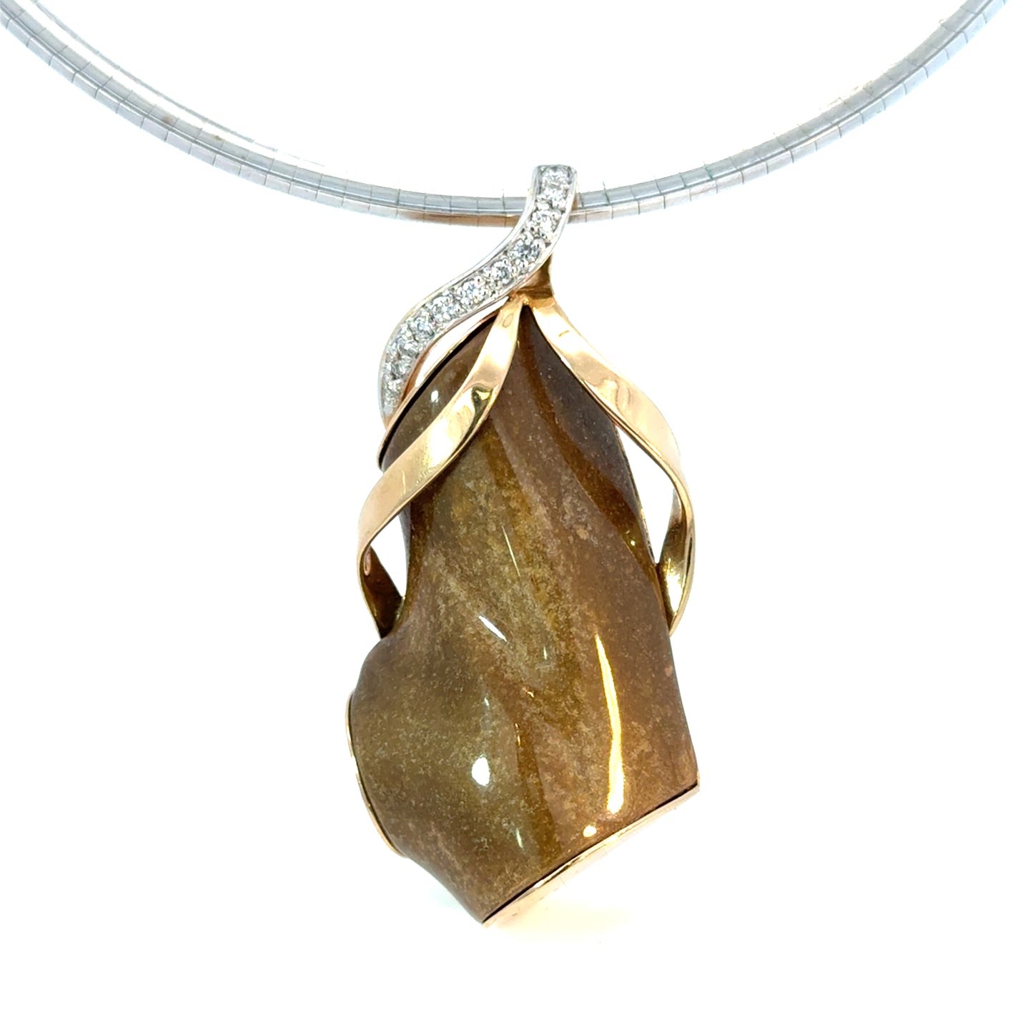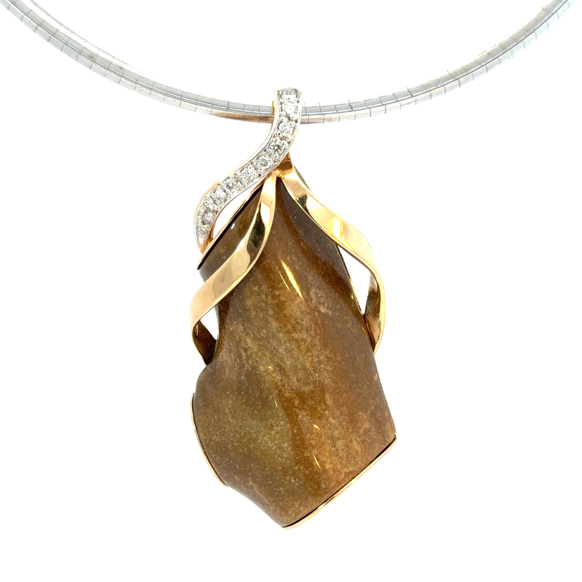 This extraordinary pendant is a true statement of nature and craftsmanship, featuring a unique piece of genuine Hawaiian coral wrapped in sculptural 14K yellow gold. The organic shape of the coral is complemented by fluid, ribbon-like gold details that flow elegantly around the stone. A gracefully curved bail set with sparkling diamonds adds brilliance and contrast to the warm, earthy tones of the coral. Marked 14K on the back, this pendant is a one-of-a-kind work of wearable art—perfect for collectors and lovers of natural gemstones.