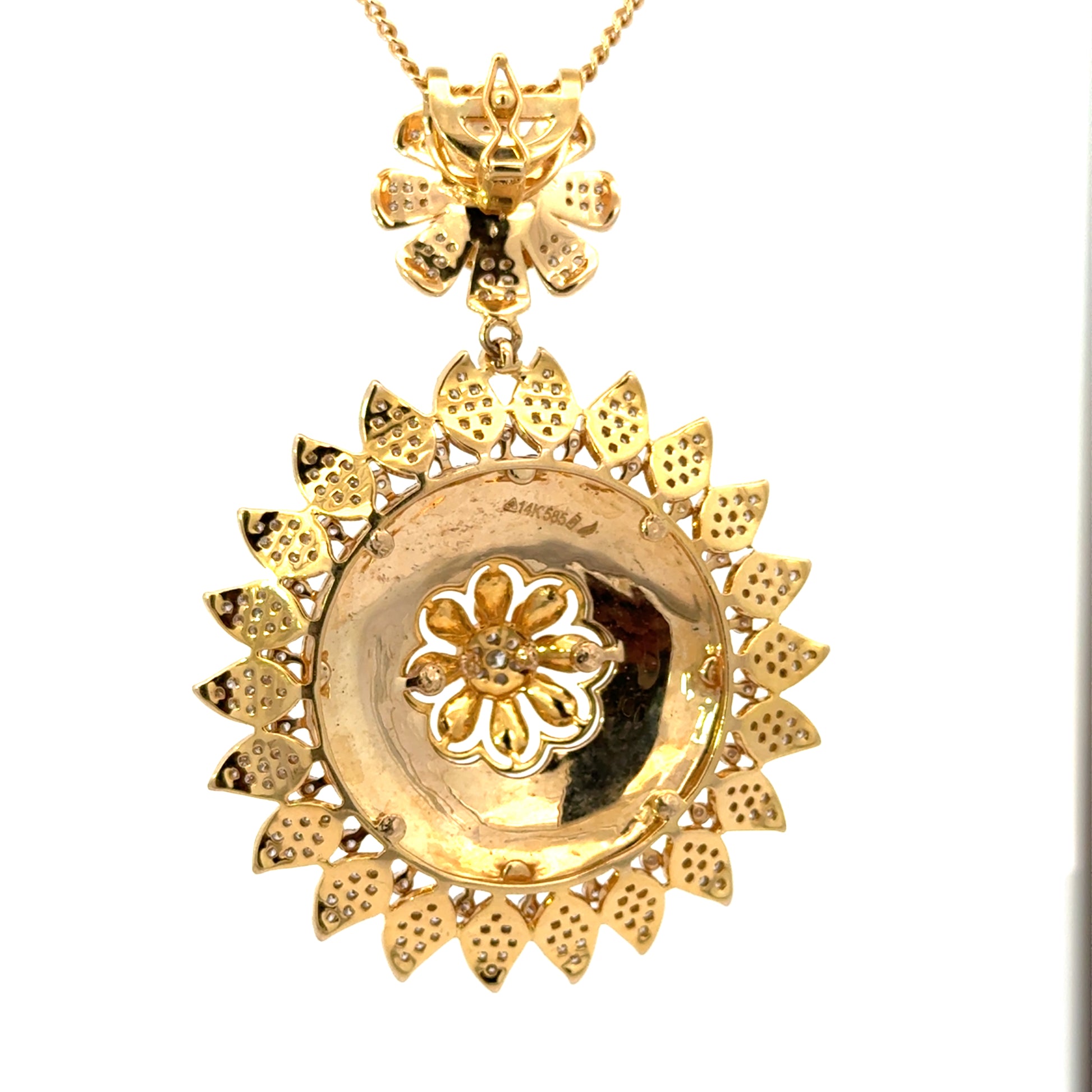 An extraordinary and highly detailed 14K yellow gold diamond and blue enamel pendant, designed in a bold and elegant medallion silhouette.
