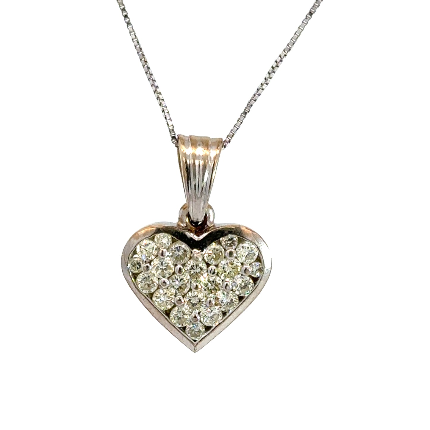 The pendant is suspended from a polished white gold bail, which adds to its refined look and allows it to hang gracefully from a chain. The back of the pendant reveals an open setting for each diamond, allowing light to enhance their brilliance. This heart pendant is a lovely, versatile accessory, perfect for adding a touch of elegance to any outfit.
