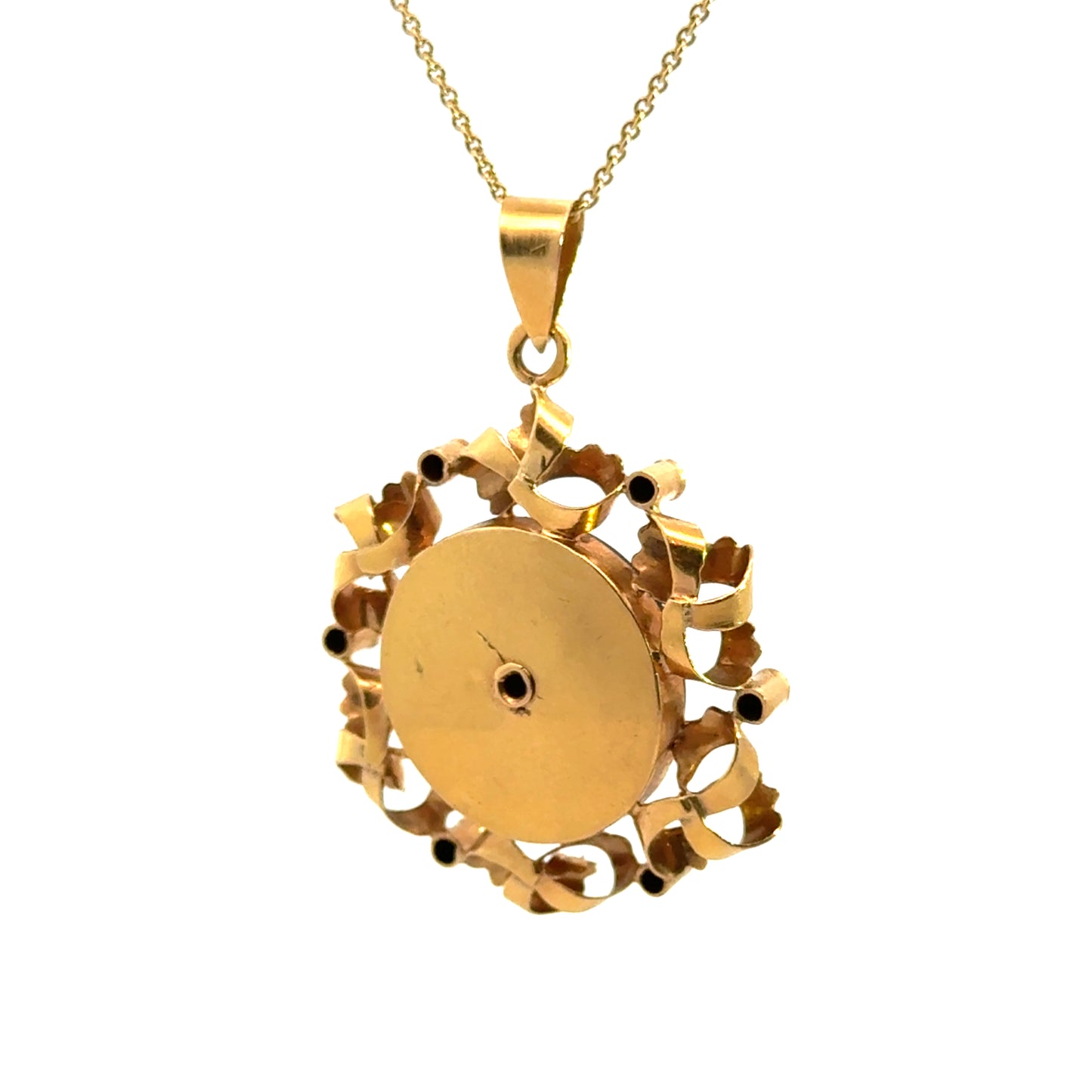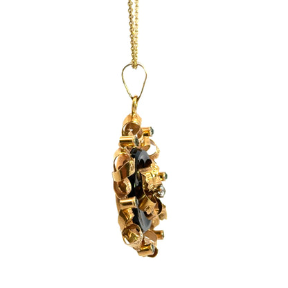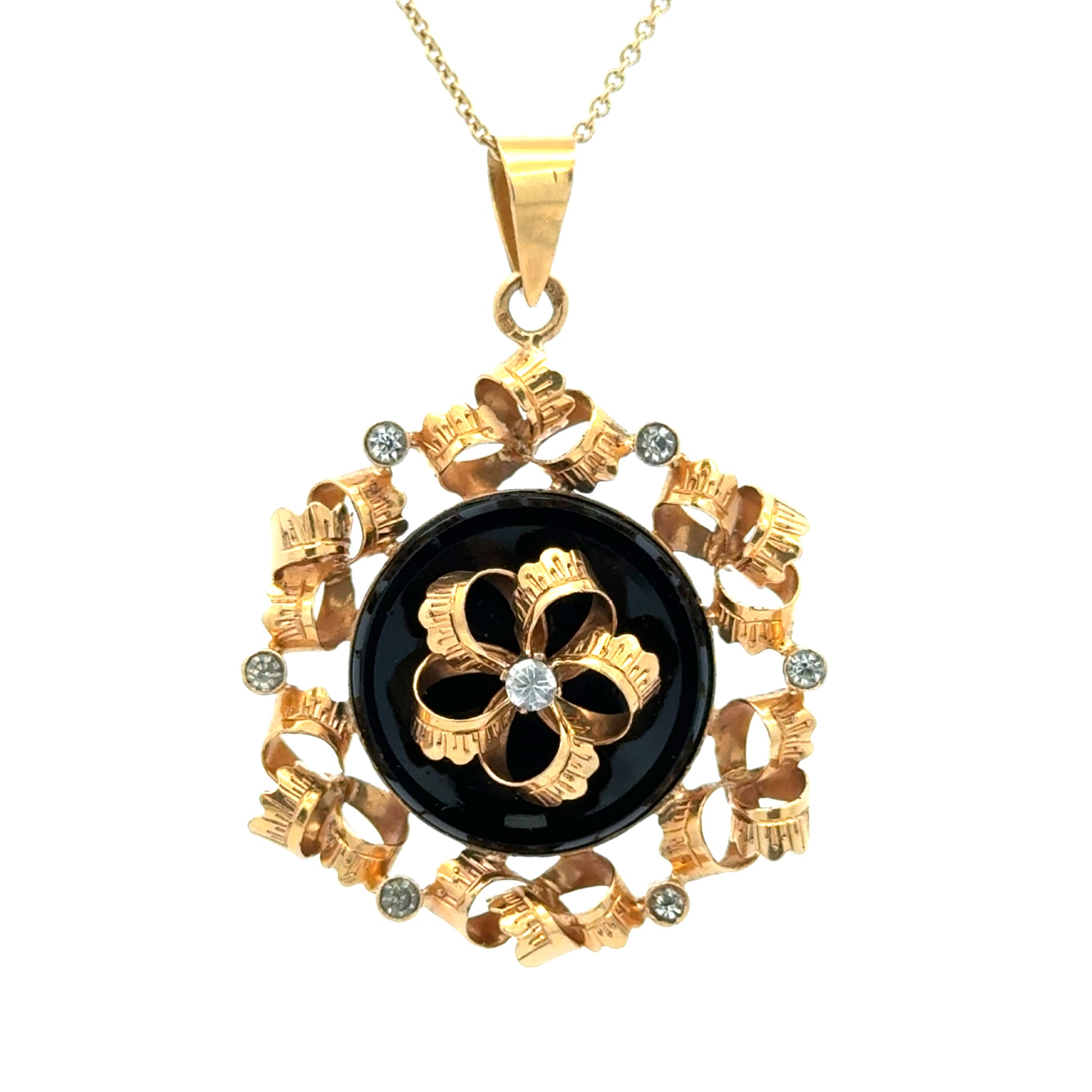 Exuding timeless elegance, this vintage retro pendant showcases a striking combination of 18K rose gold, deep black onyx, and sparkling diamonds. The ornate floral centerpiece is crafted from richly hued rose gold, set atop a glossy round onyx disk for bold contrast. Surrounding the center are meticulously curled gold ribbons accented by bezel-set diamonds, adding shimmer and dimension. A brilliant diamond sparkles at the heart of the flower motif, enhancing the pendant’s romantic allure. Beautifully crafted with intricate detailing, this pendant makes a unique statement piece, perfect for vintage jewelry lovers or collectors of mid-century design.
