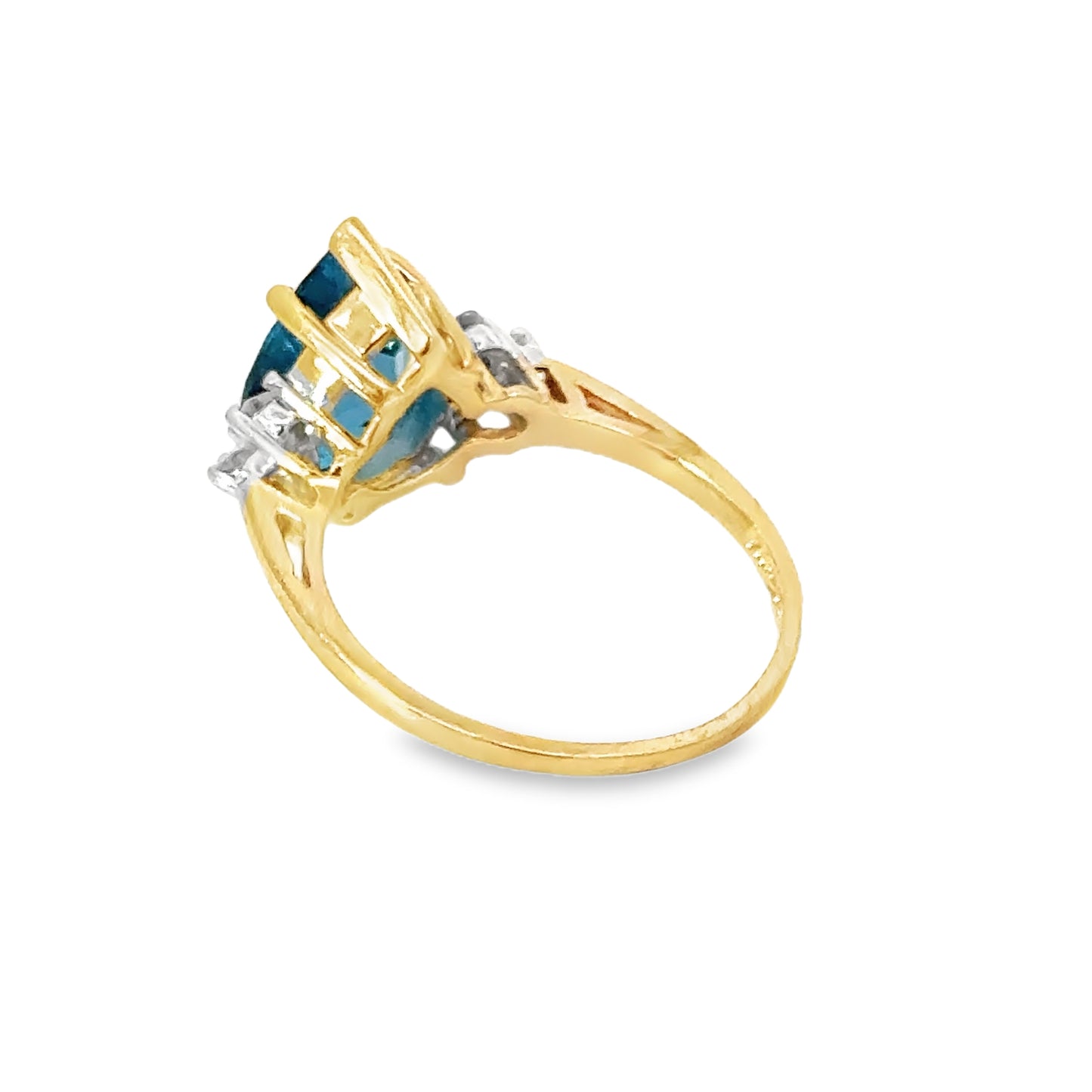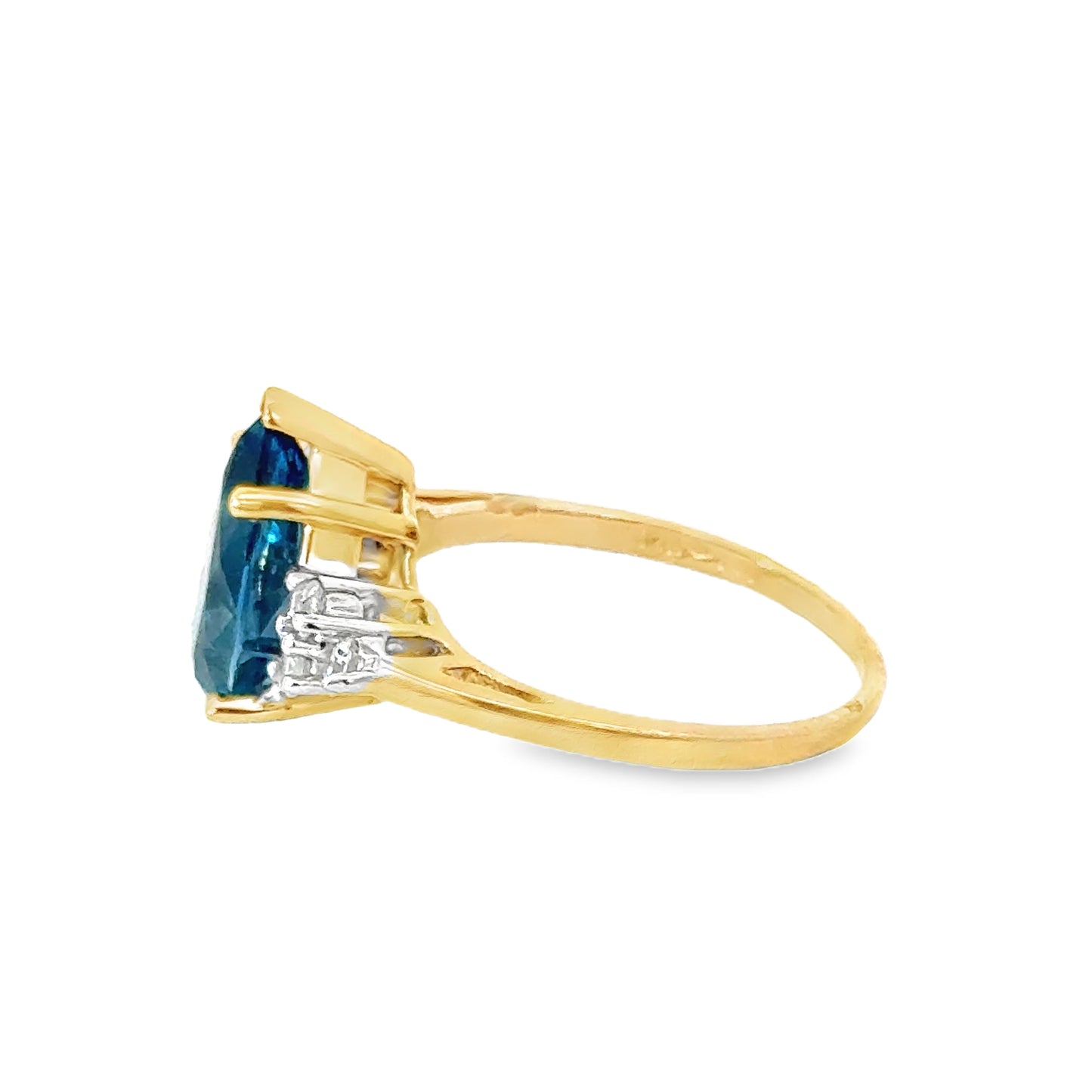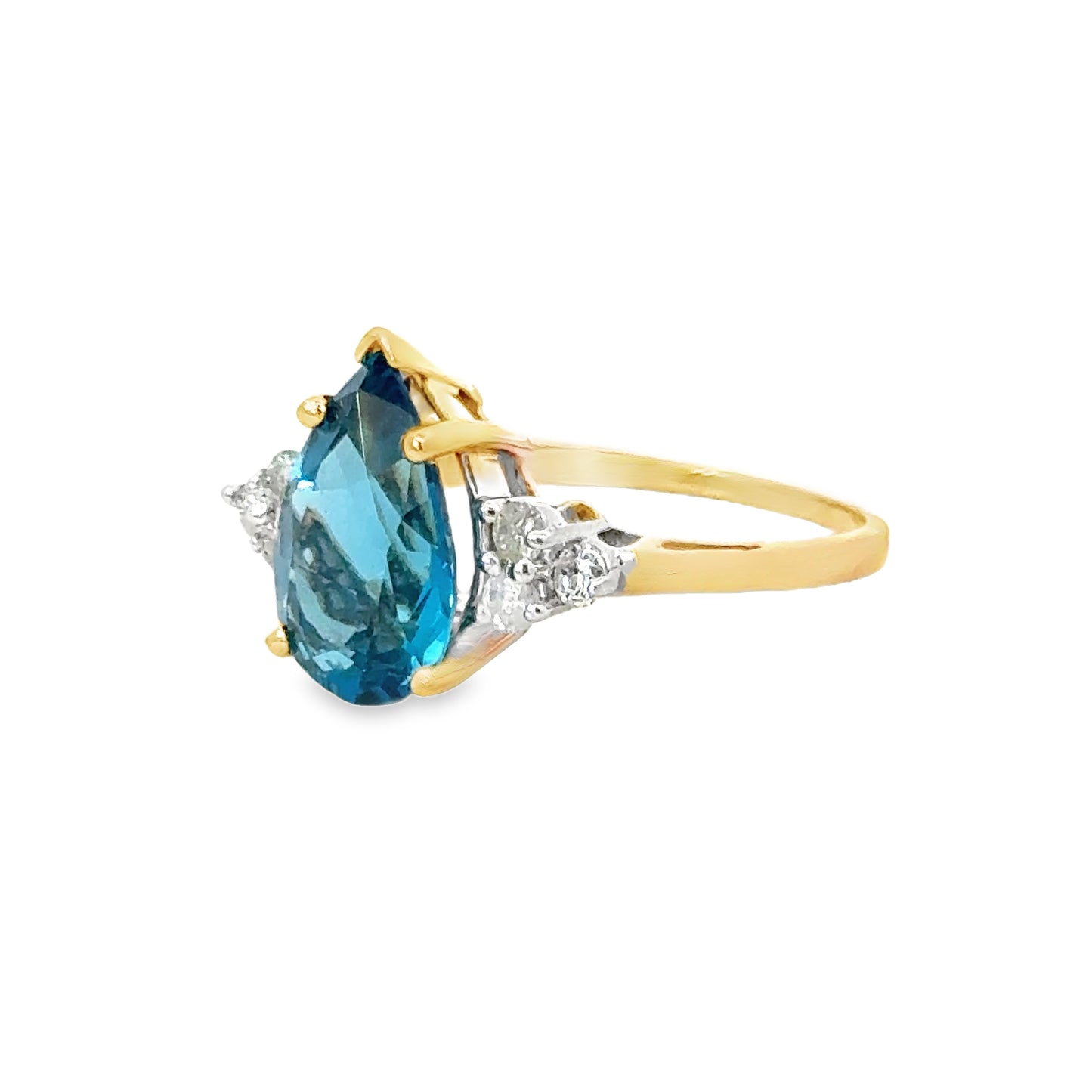 Exquisite 14K yellow gold ring showcasing a breathtaking pear-shaped blue topaz as the center stone, evoking the deep and mesmerizing hues of the ocean. The vibrant topaz is flanked on either side by sparkling diamonds, set in white gold prongs, which enhance the radiance and beauty of the central gem. The contrast between the rich yellow gold band and the stunning blue of the topaz makes this ring a standout piece, perfect for adding a touch of elegance and color to any outfit. The refined craftsmanship ensures a comfortable fit, making it a treasured addition to any jewelry collection.