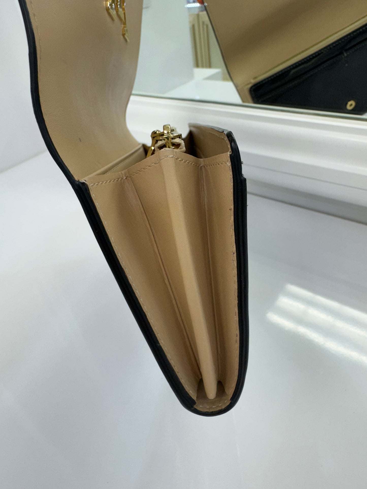 - Interior: Zippered coin compartment, bill slots, card slots