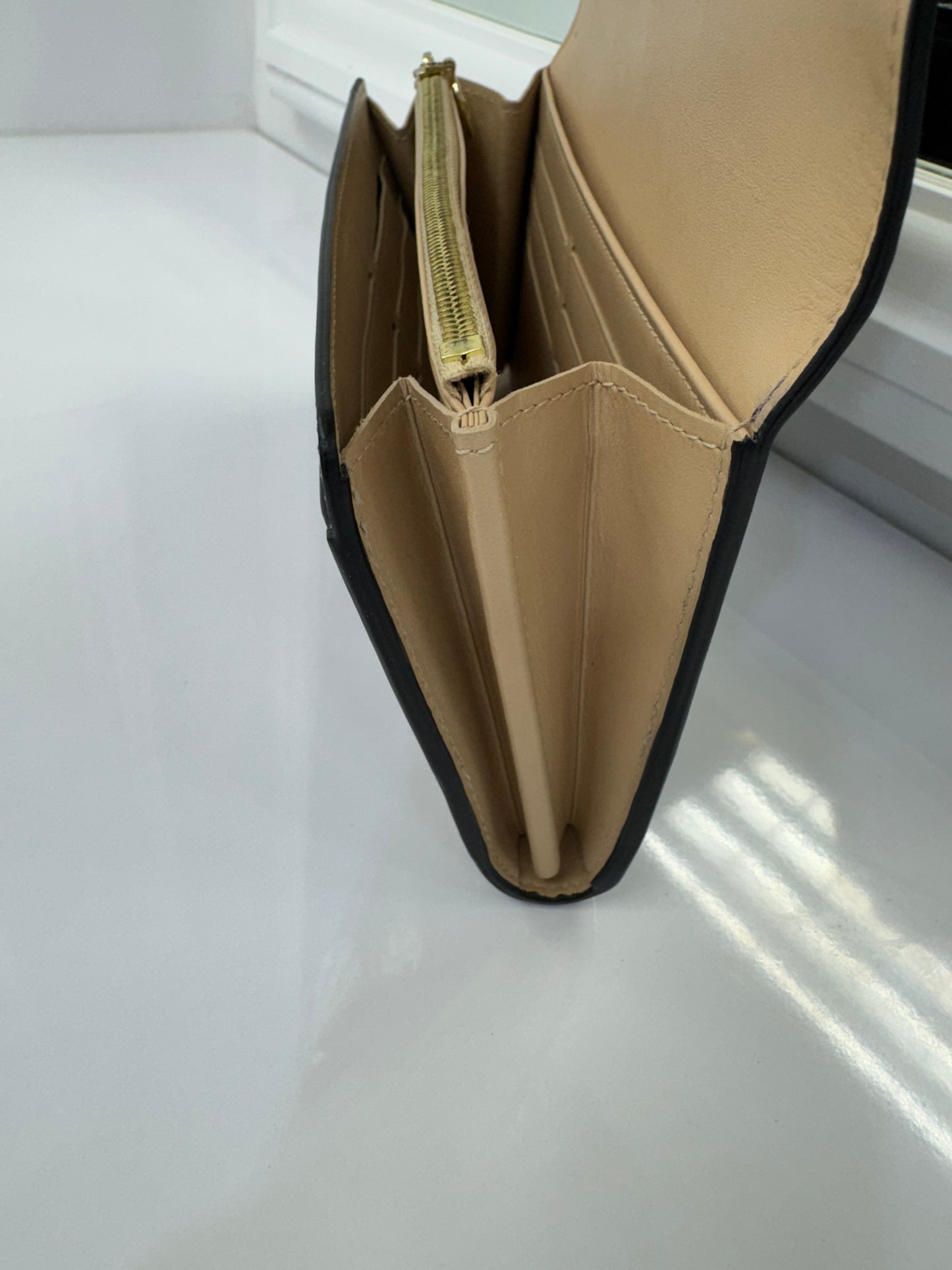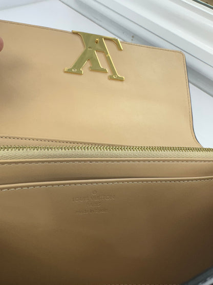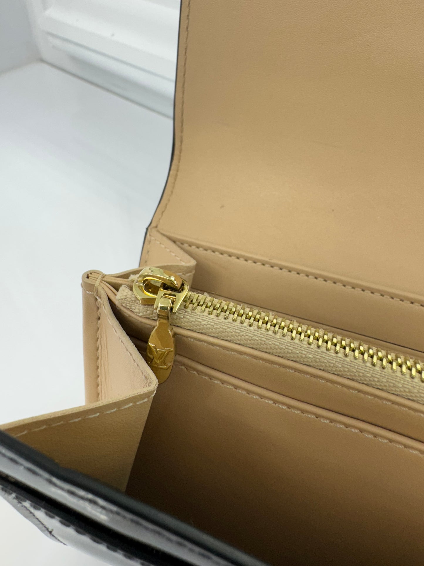The interior features a smooth beige leather lining with multiple card slots, a zippered coin pocket, and bill compartments, ensuring style doesn’t come at the cost of practicality. The signature LV clasp adds a statement finish, while the “Louis Vuitton Paris – Made in Spain” stamp authenticates its craftsmanship.
