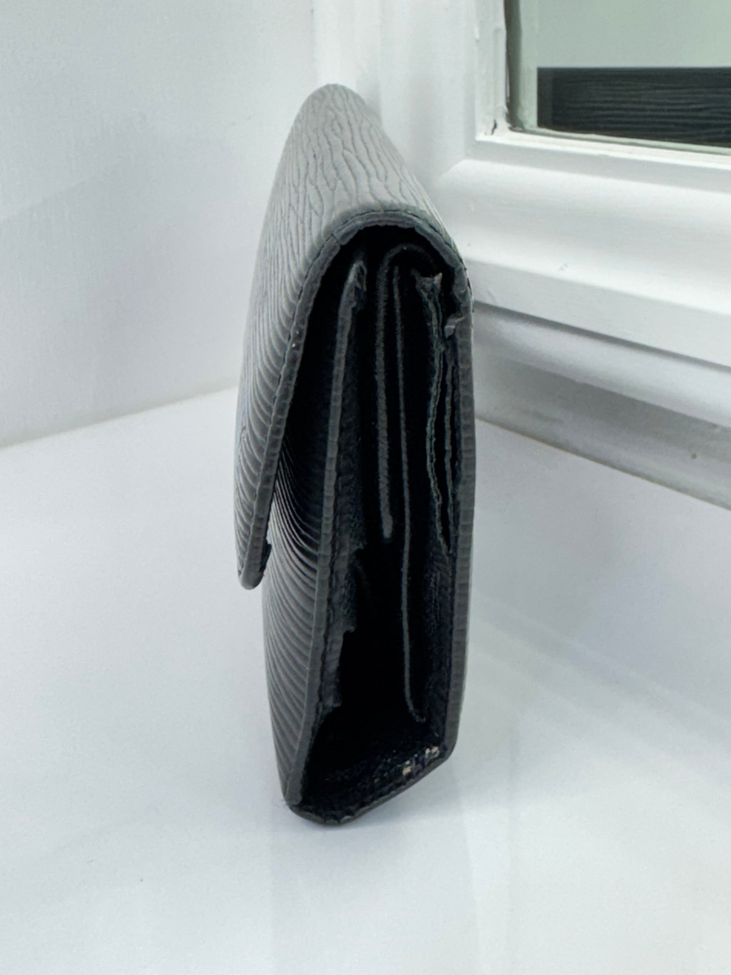 Timeless and refined, this authentic Louis Vuitton long wallet is crafted from signature black Epi leather with discreet LV embossing on the front corner. Featuring a slim, structured silhouette and flap snap closure, this wallet blends understated elegance with everyday practicality.
