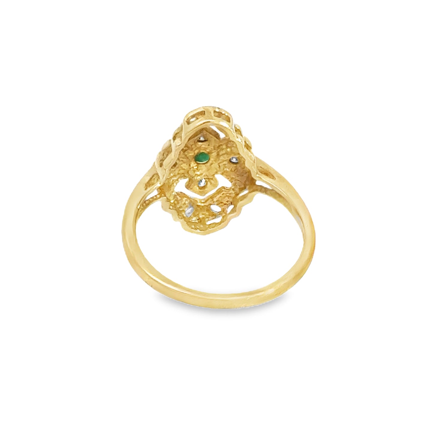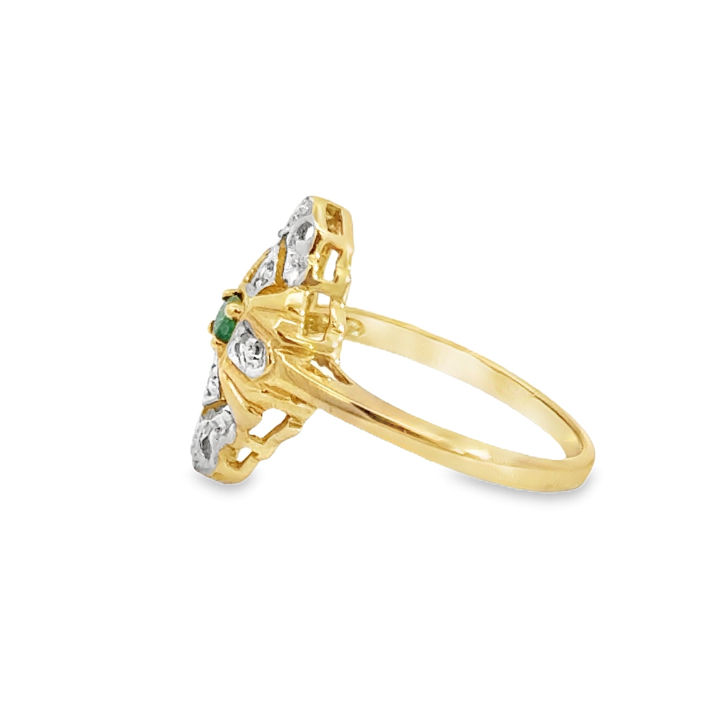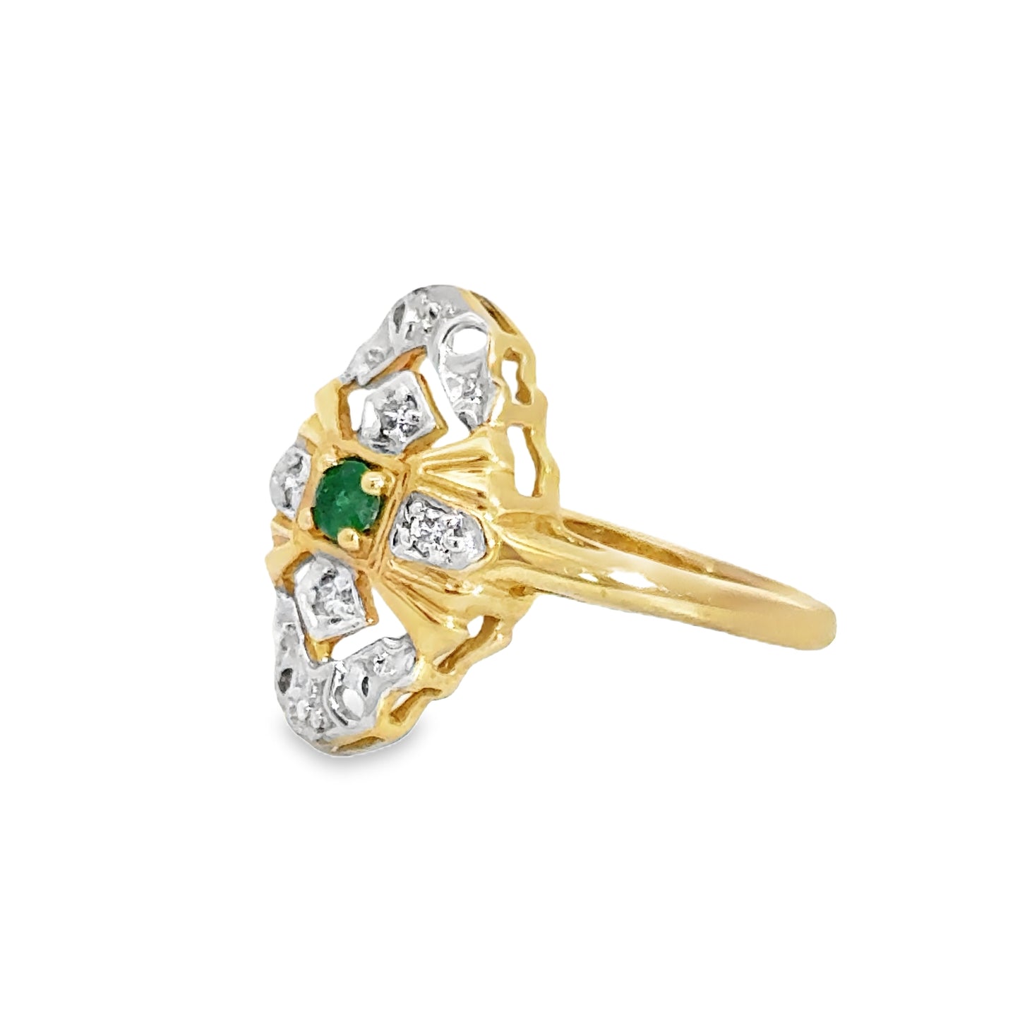 Elegant two-tone ring features a striking combination of emeralds and diamonds in an eye-catching, intricate design. The central emerald is framed by sparkling diamonds, with the surrounding metalwork crafted in a beautiful open pattern that allows light to flow through, enhancing the brilliance of the stones. The ring’s two-tone setting—yellow gold and white accents—creates a lovely contrast, emphasizing the rich green of the emerald and the sparkling white of the diamonds. Its delicate, yet detailed design makes it an elegant statement piece, perfect for someone who appreciates refined and sophisticated jewelry.