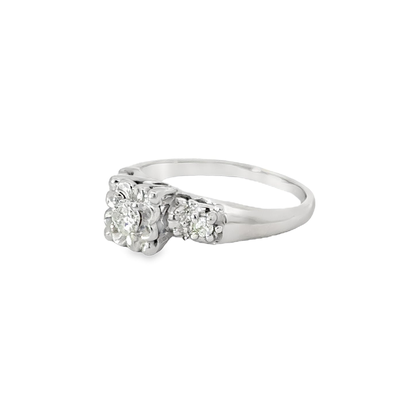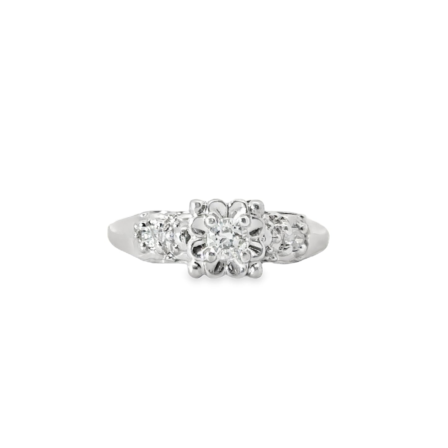 Delicate and charming antique engagement ring, crafted from 14K white gold. The ring features a flower-inspired design, with the center diamond set in a floral-shaped prong setting that accentuates its brilliance. Flanking the center diamond are smaller diamonds embedded in the band, adding a touch of sparkle to the overall design. The ring’s floral motif gives it a romantic and timeless appeal, perfect for a future bride-to-be who appreciates classic elegance with a unique twist. This beautiful piece is sure to be cherished and admired for its intricate detailing and vintage charm.