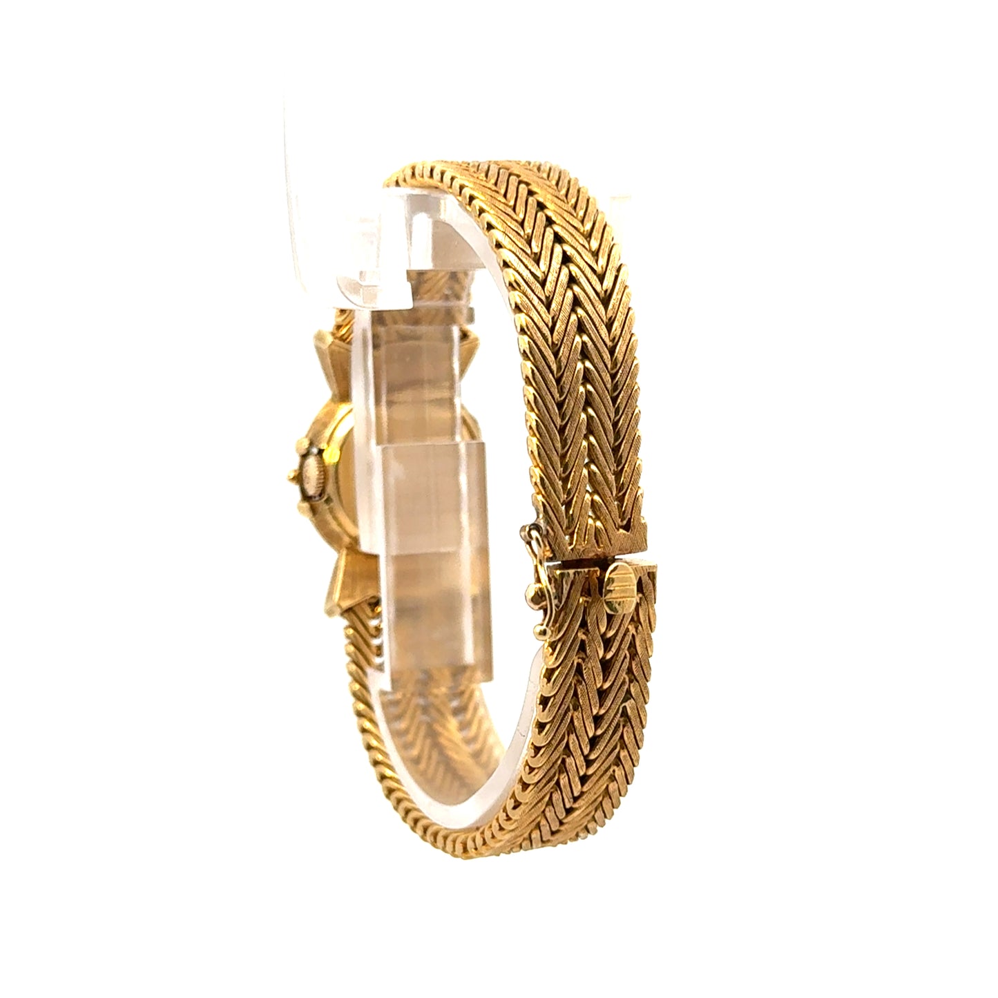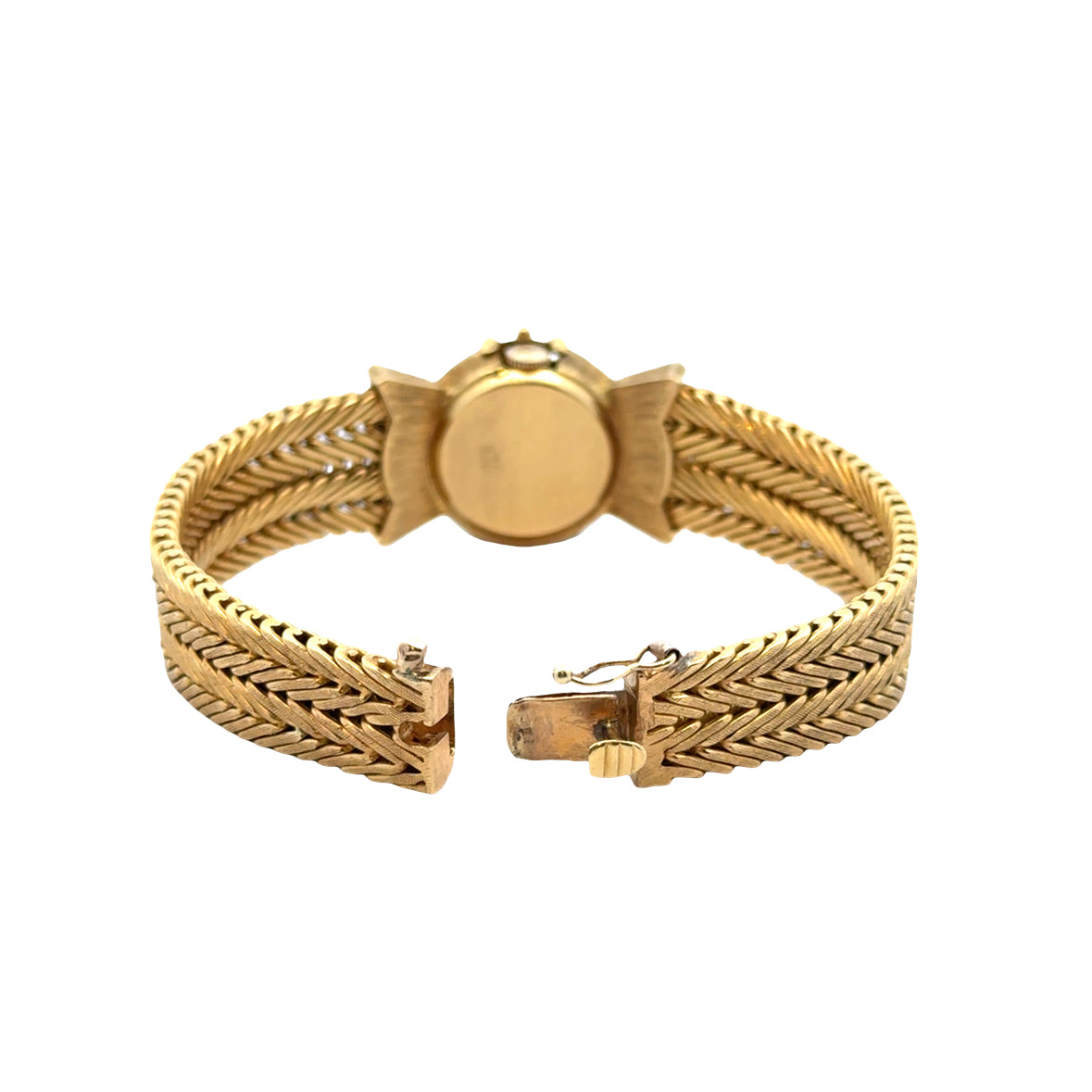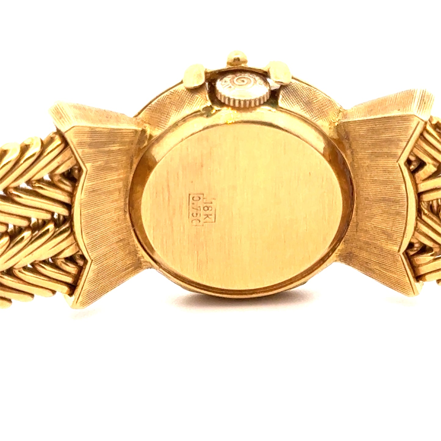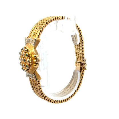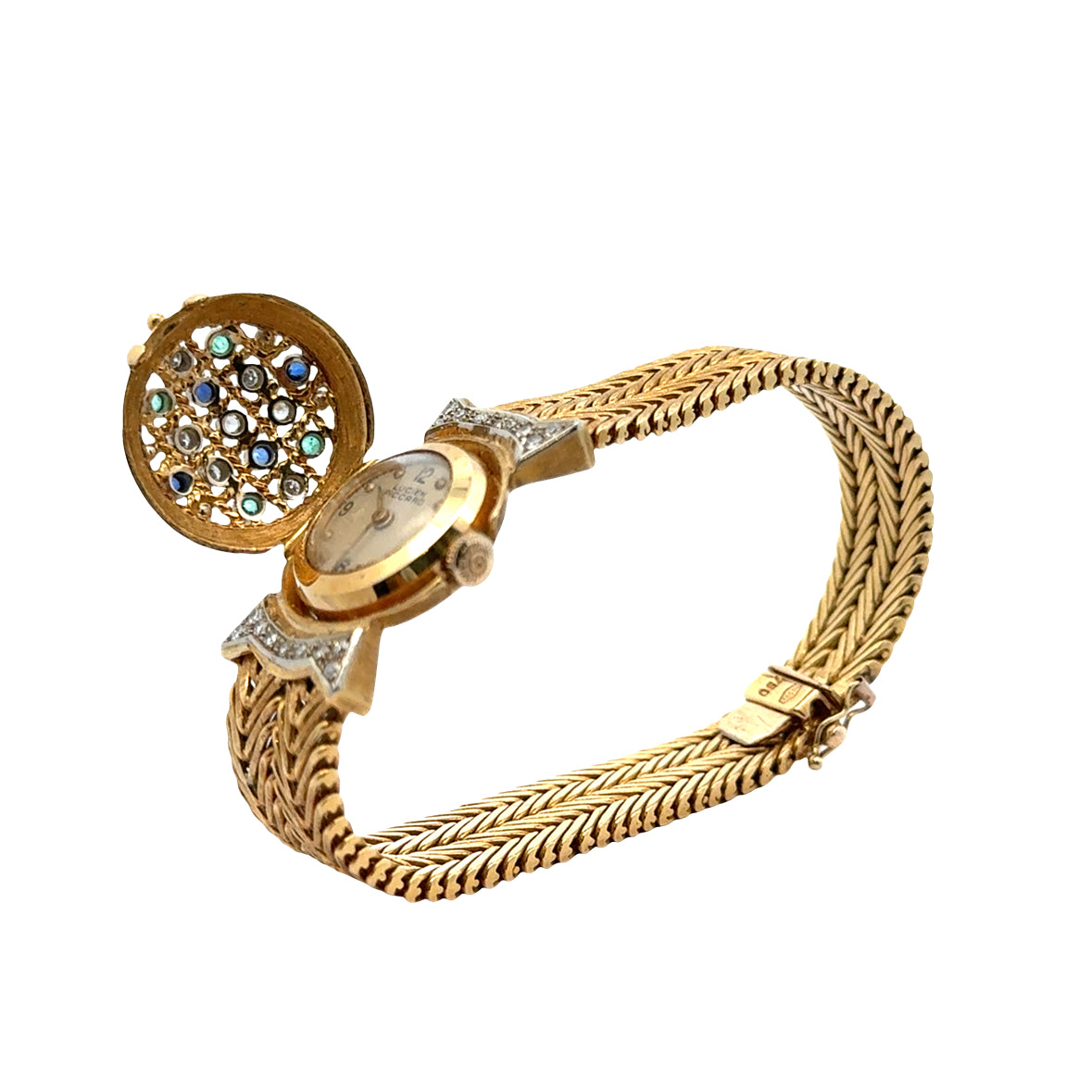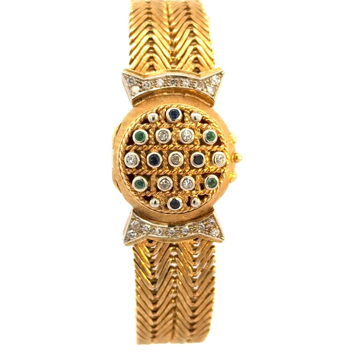 This stunning vintage Lucien Piccard ladies’ watch is a luxurious blend of fine jewelry and timekeeping. Crafted in rich 18k yellow gold, the bracelet features an elegant chevron-link design and is adorned with sparkling diamonds, accented by vibrant emeralds and sapphires. The watch face is discreetly hidden beneath a gem-studded cover, giving the piece the appearance of a glamorous bracelet. With its intricate detailing and timeless sophistication, this concealed timepiece is perfect for collectors and lovers of vintage elegance alike. Marked 18K on the case back and bracelet closure.