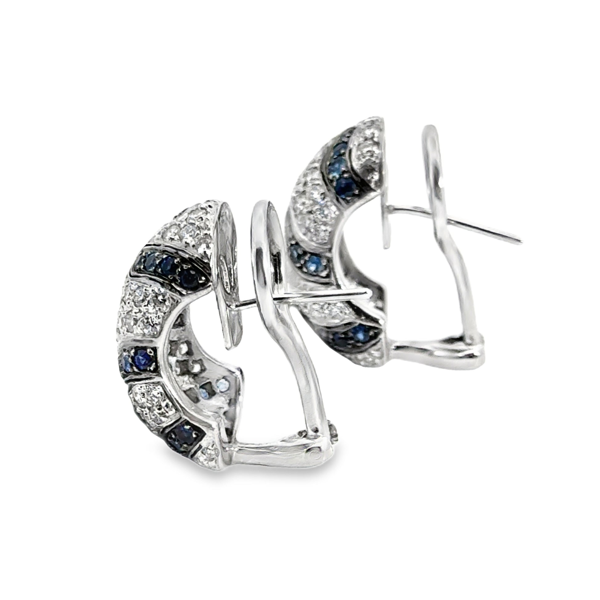 These elegant 18K white gold hoop earrings are beautifully crafted and richly set with a striking combination of brilliant-cut diamonds and deep blue sapphires. The diamonds, totaling approximately 3.24 carats, are meticulously set across the surface to create exceptional brilliance, while the channel-set sapphires, totaling approximately 1.44 carats, provide bold contrast and visual depth.