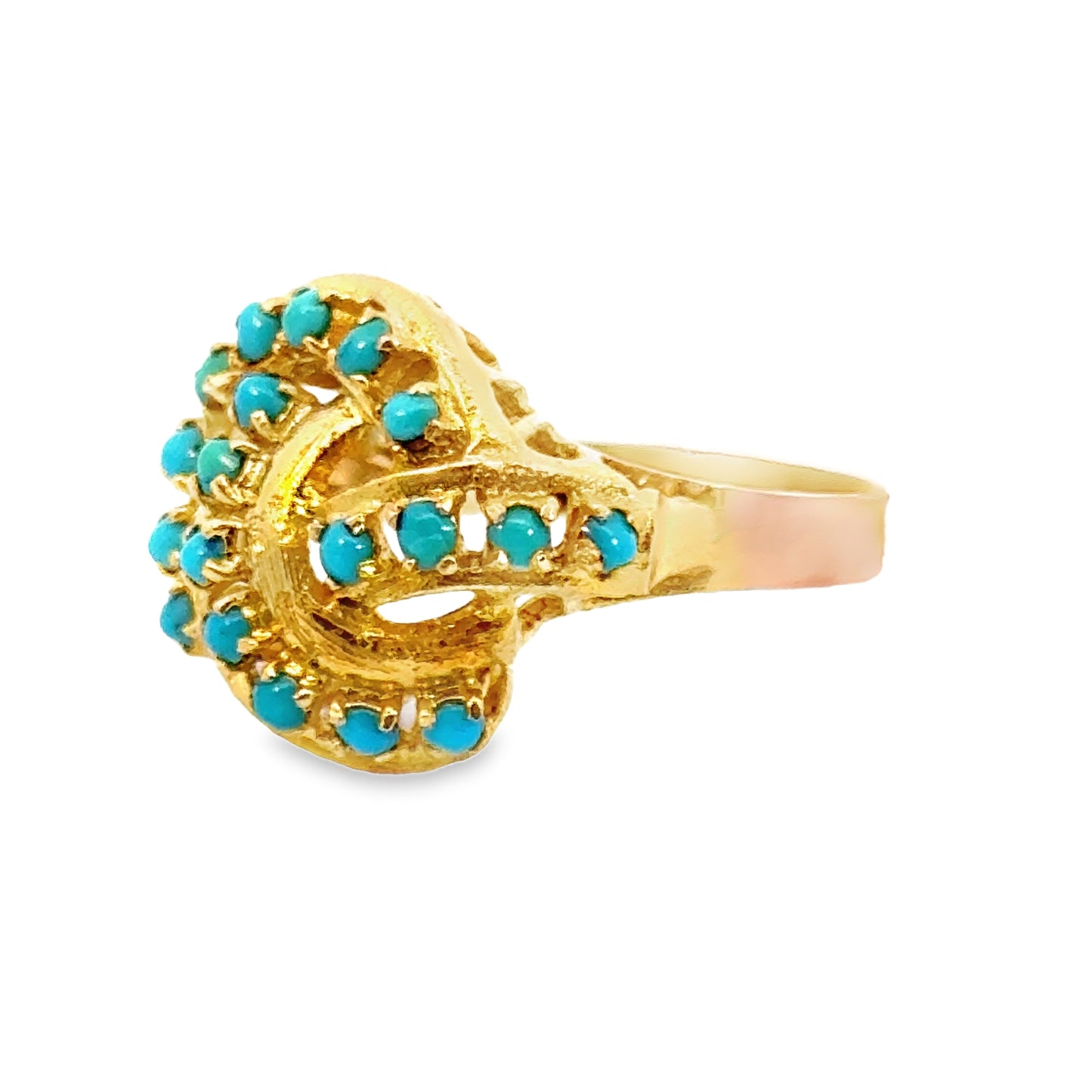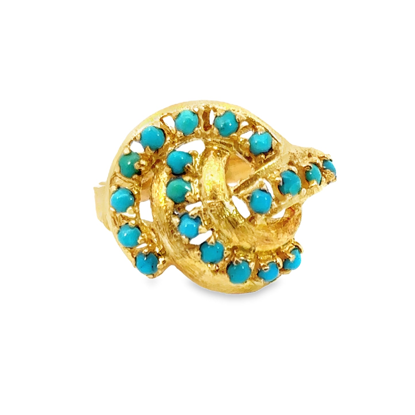 18K yellow gold swirl ring featuring vibrant turquoise stones. The design is centered around a dynamic swirling pattern, with small, round turquoise gems set along the curves of the gold structure. The intricate openwork of the gold enhances the flow of the design, creating a lively yet elegant look. The bright blue hue of the turquoise contrasts beautifully with the rich yellow gold, giving this piece a playful yet sophisticated aesthetic. This swirl ring is a perfect statement accessory for someone seeking a bold and unique design.