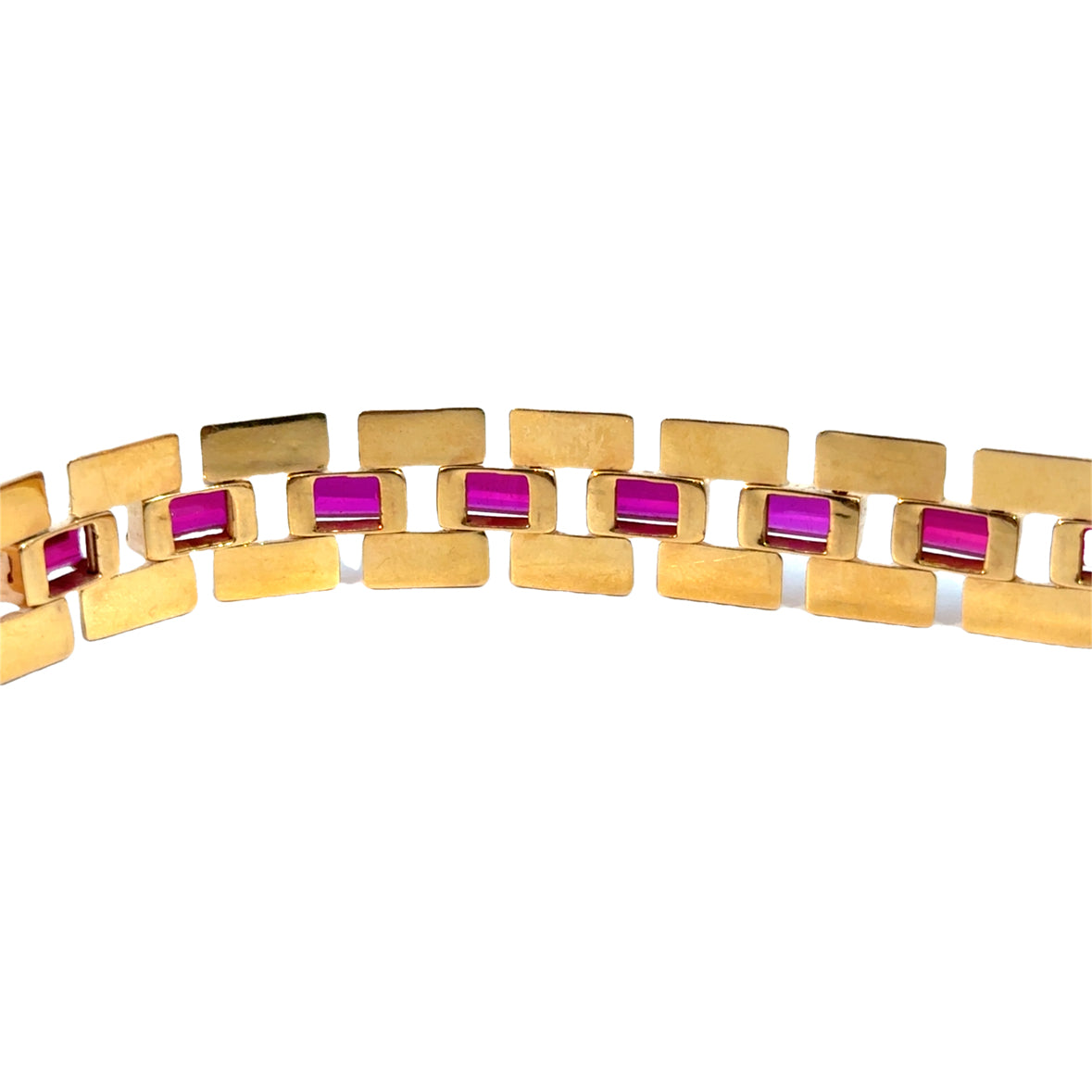 The design consists of geometric rose gold links, each meticulously set with baguette-cut rubies, creating a seamless flow of color and texture. The deep red hue of the rubies contrasts beautifully with the soft blush of the rose gold, enhancing the bracelet’s luxurious appeal.