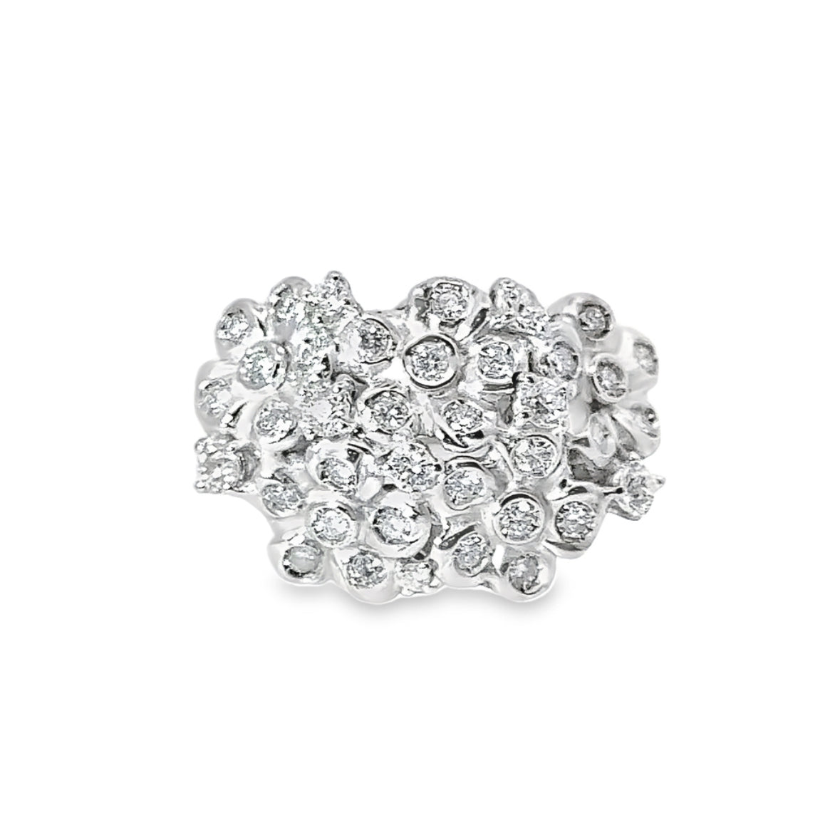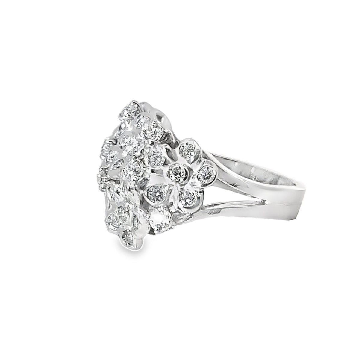 A beautiful and luxurious ring made of 18K white gold featuring 5-petal diamond flower design. Each petal sparkles with VS/G round-cut diamonds, creating a dazzling and beautiful statement piece.