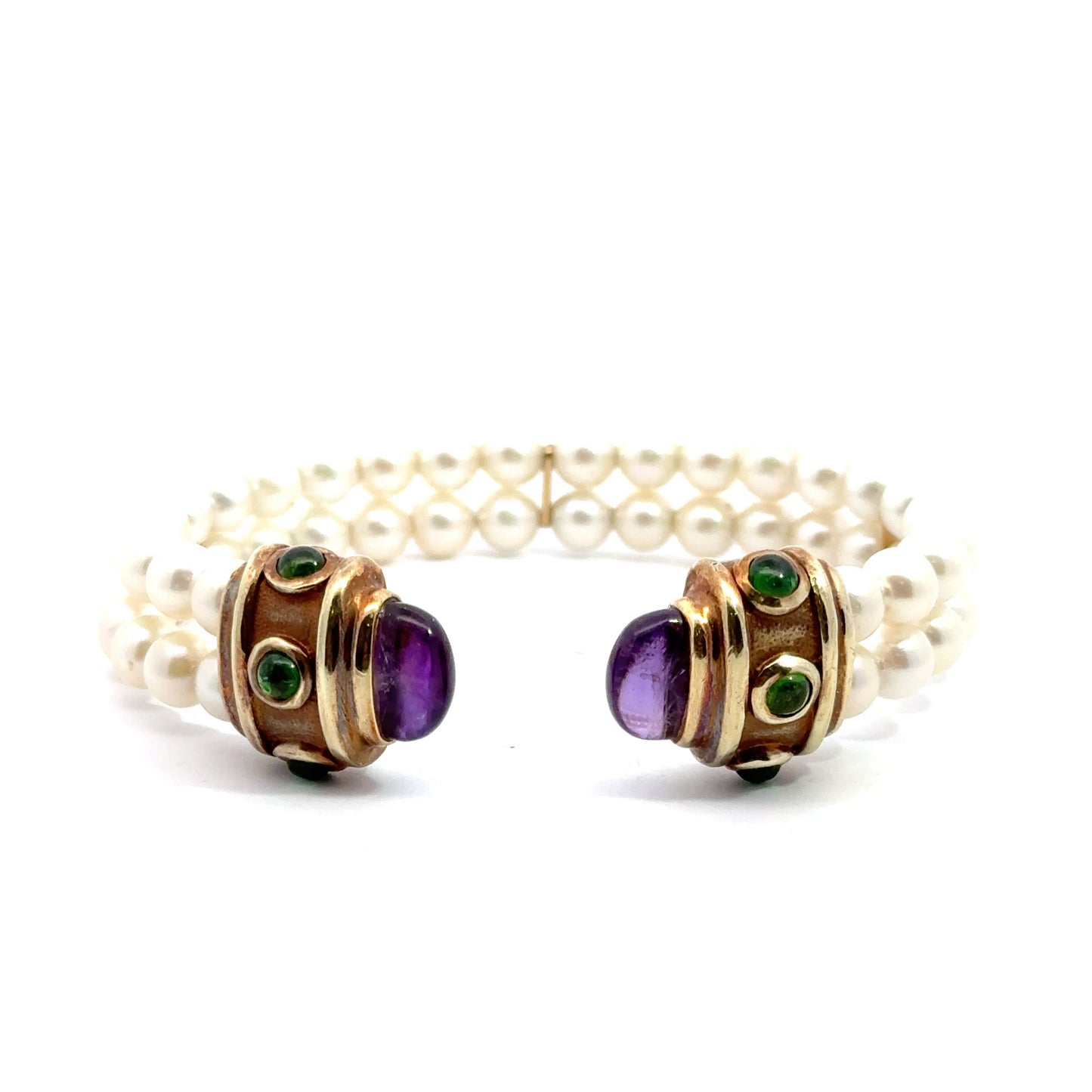 This stunning bangle features two rows of elegant pearls, interspersed with gold accents that house vivid green emeralds and purple amethyst gemstones. Perfect for adding a touch of sophistication to any ensemble.