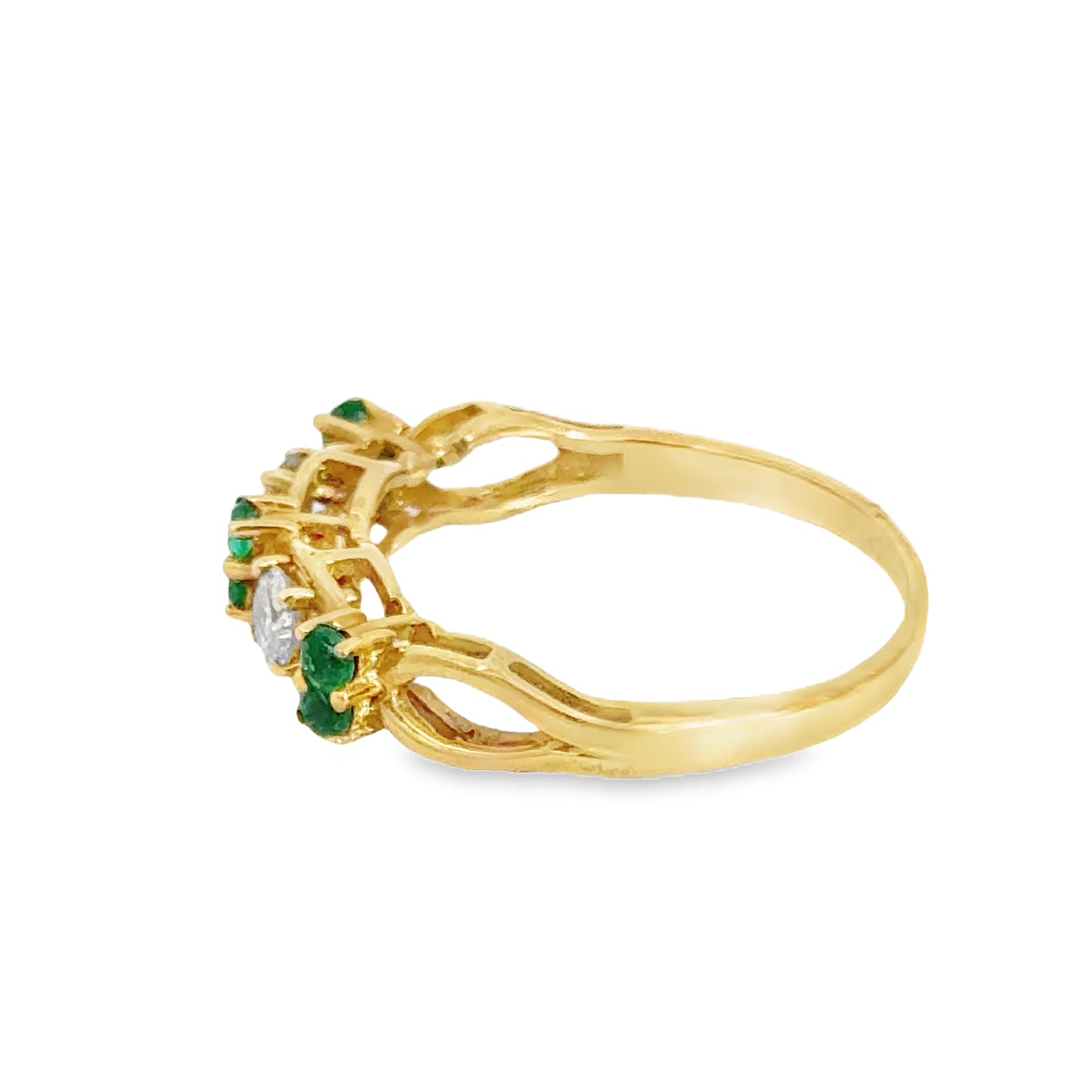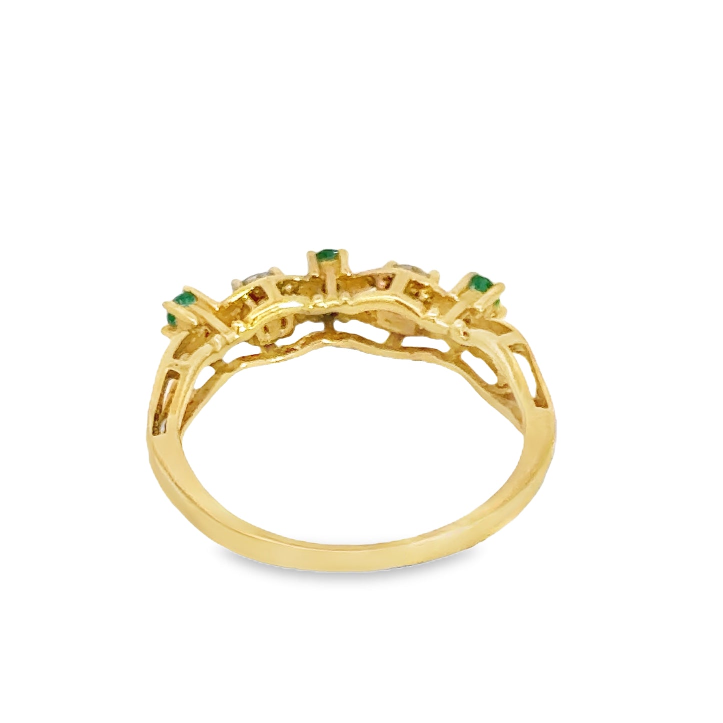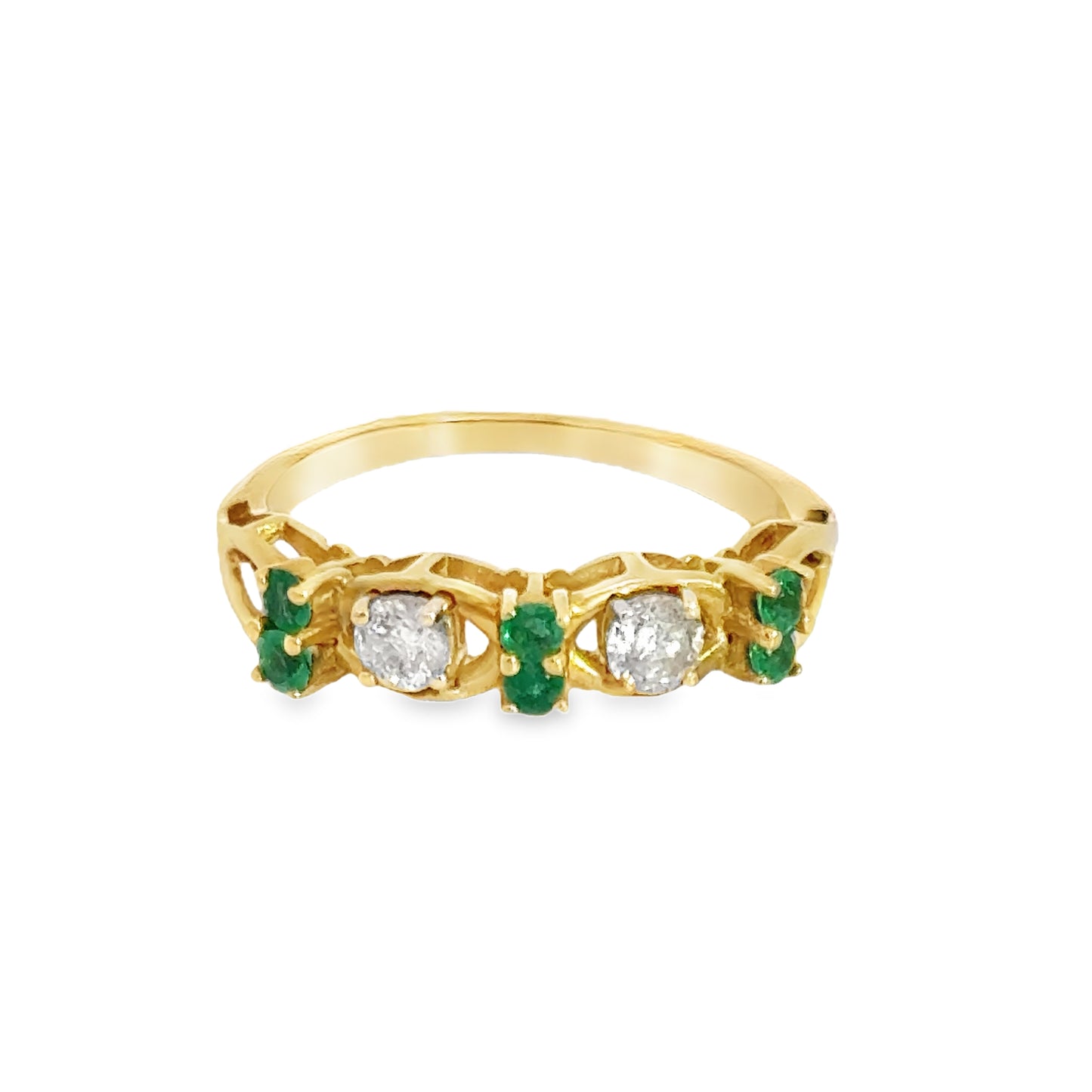 Delicate 18K yellow gold ring features a charming alternating pattern of emeralds and diamonds, creating a lovely balance of color and sparkle. The finely crafted gold setting gently cradles each gemstone, with the openwork design adding an airy and elegant touch to the band. The ring is versatile enough to be worn daily, yet sophisticated enough to complement more formal attire for special occasions. Its subtle beauty and classic combination of emeralds and diamonds make it a timeless piece that will be cherished for years to come.
