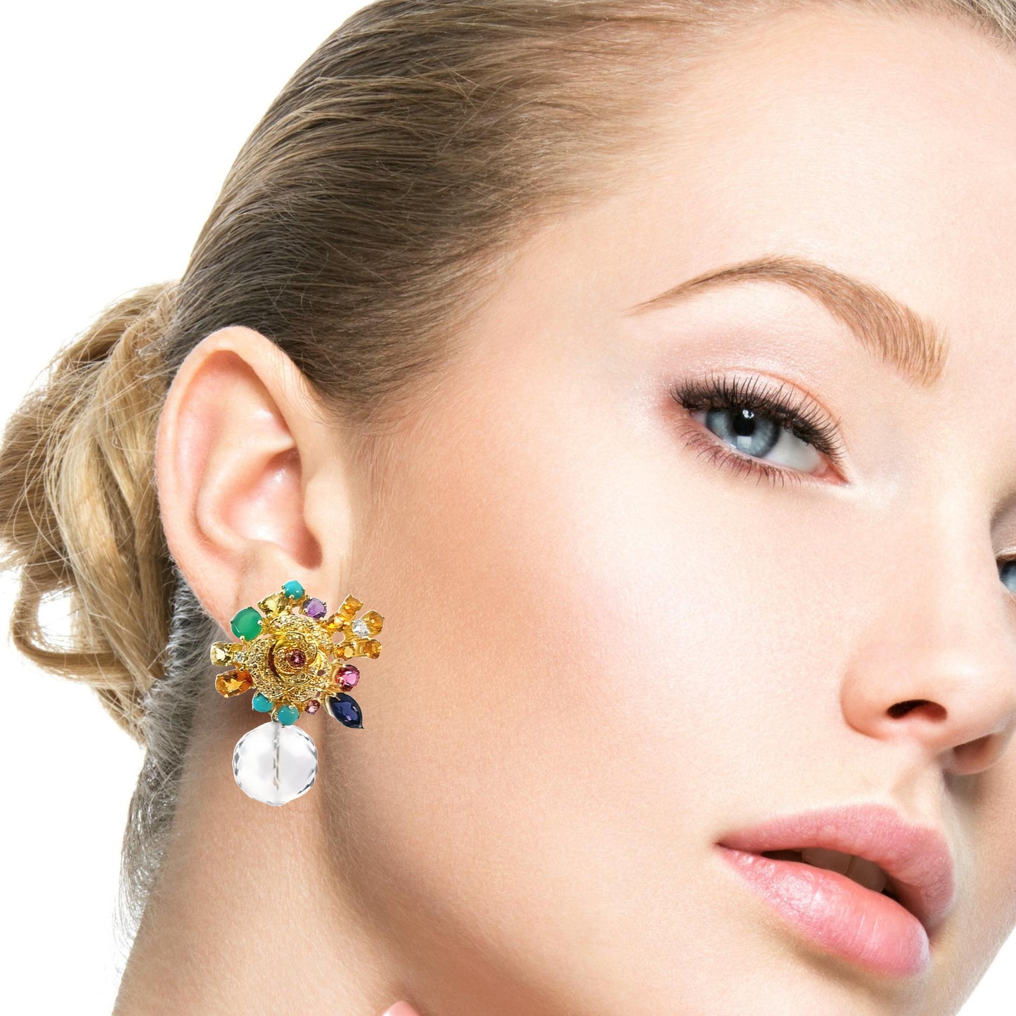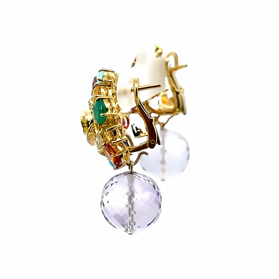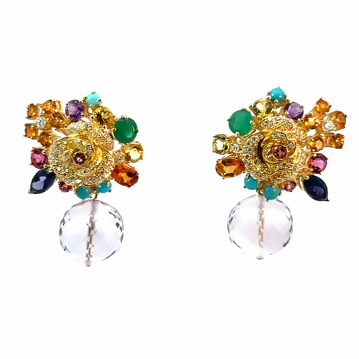 Illuminate your ensemble with these showstopper color galore multi-gemstone earrings. A symphony of vibrant hues set in 18K yellow gold. Featured at the center of this gemstone bouquet is a diamond studded rose, surrounded by a gemstone flower arrangement that is both artistic and stunning. Each earring creates a luxurious palette that catches the light and captivates the eye.