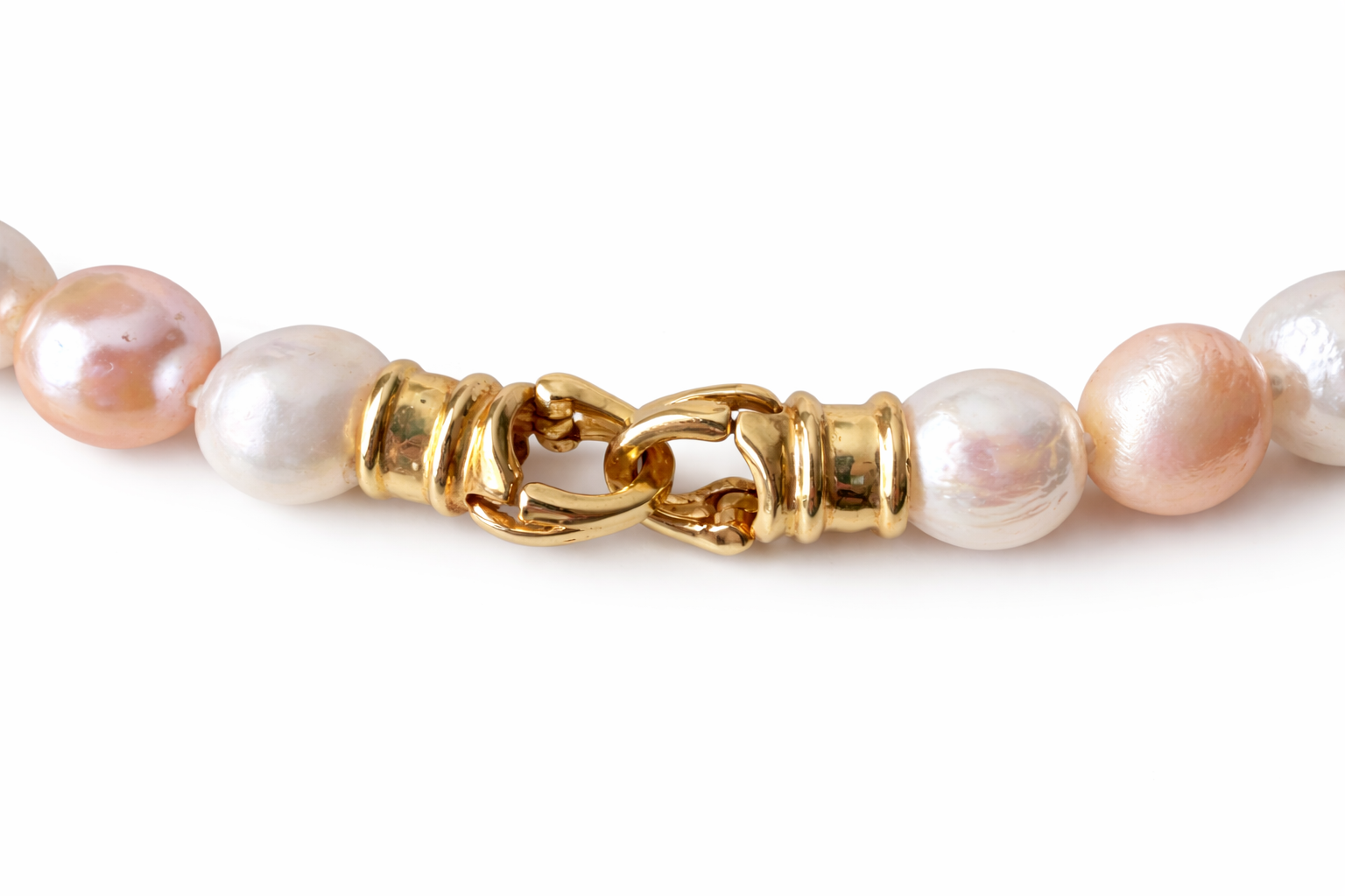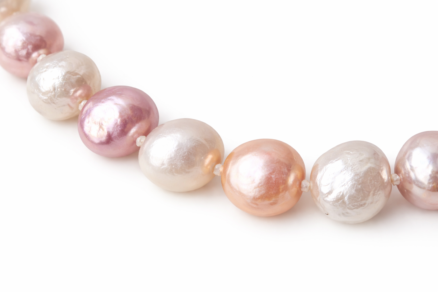 A beautiful strand of natural freshwater pearls featuring soft pink, peach, ivory, and subtle silver overtones. Each pearl displays an organic baroque shape with luminous nacre and natural surface character, creating a unique and elegant necklace full of personality and charm.