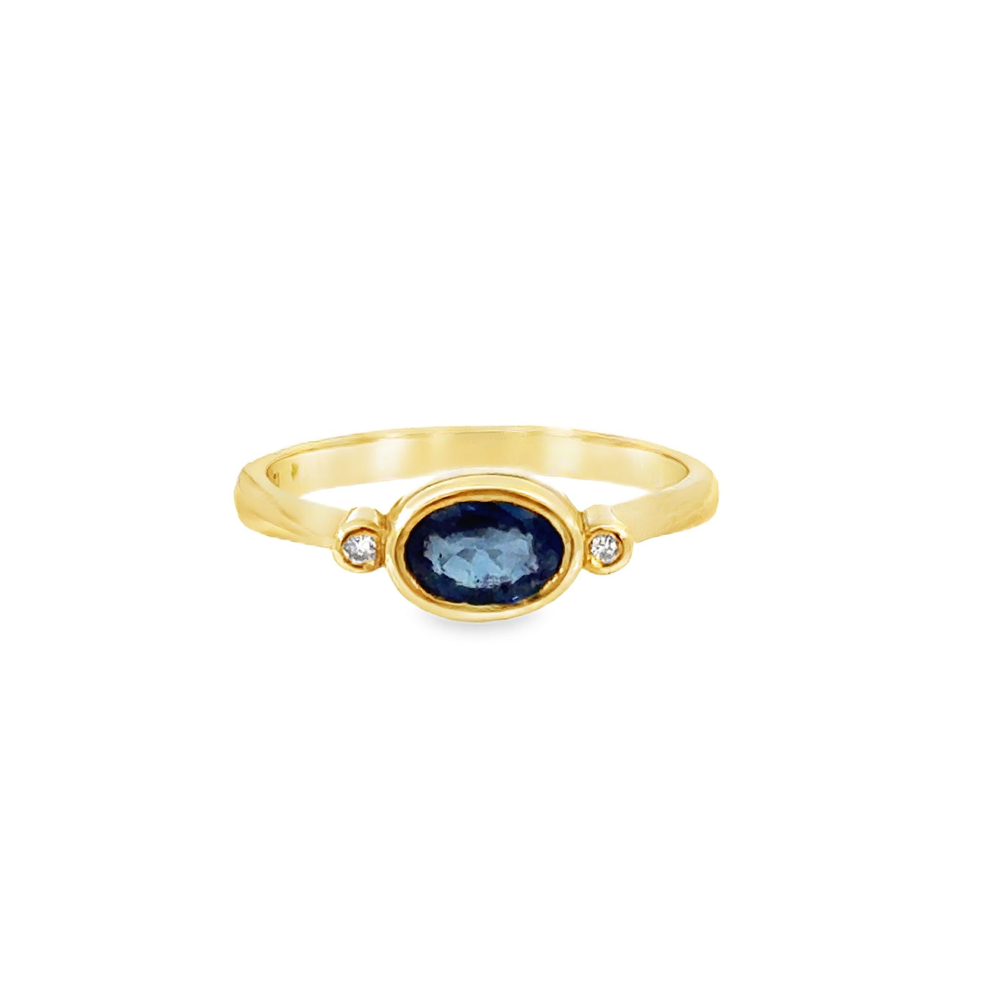 A refined and timeless design, this 14K yellow gold ring features a vivid oval-cut blue topaz, bezel-set for a sleek and modern finish. The gemstone’s serene blue tone is complemented by two sparkling diamond accents, creating a balanced and sophisticated aesthetic.