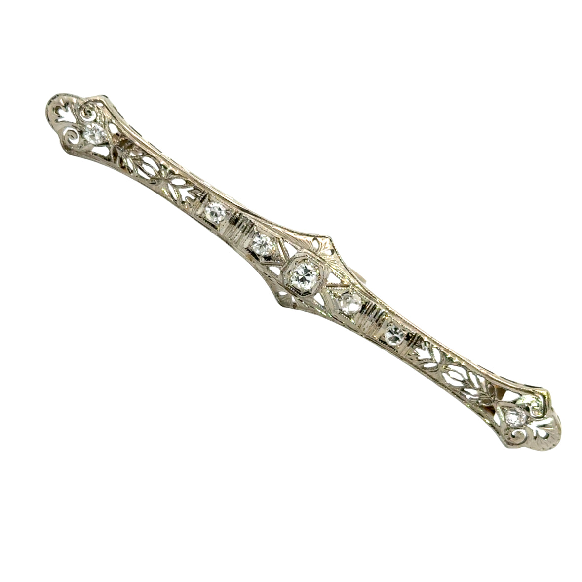 This elegant 1920s Art Deco bar pin is crafted in platinum, featuring a refined openwork filigree design with delicate scroll and floral motifs. The elongated, slightly curved shape enhances its sophisticated silhouette, making it a timeless and versatile piece.