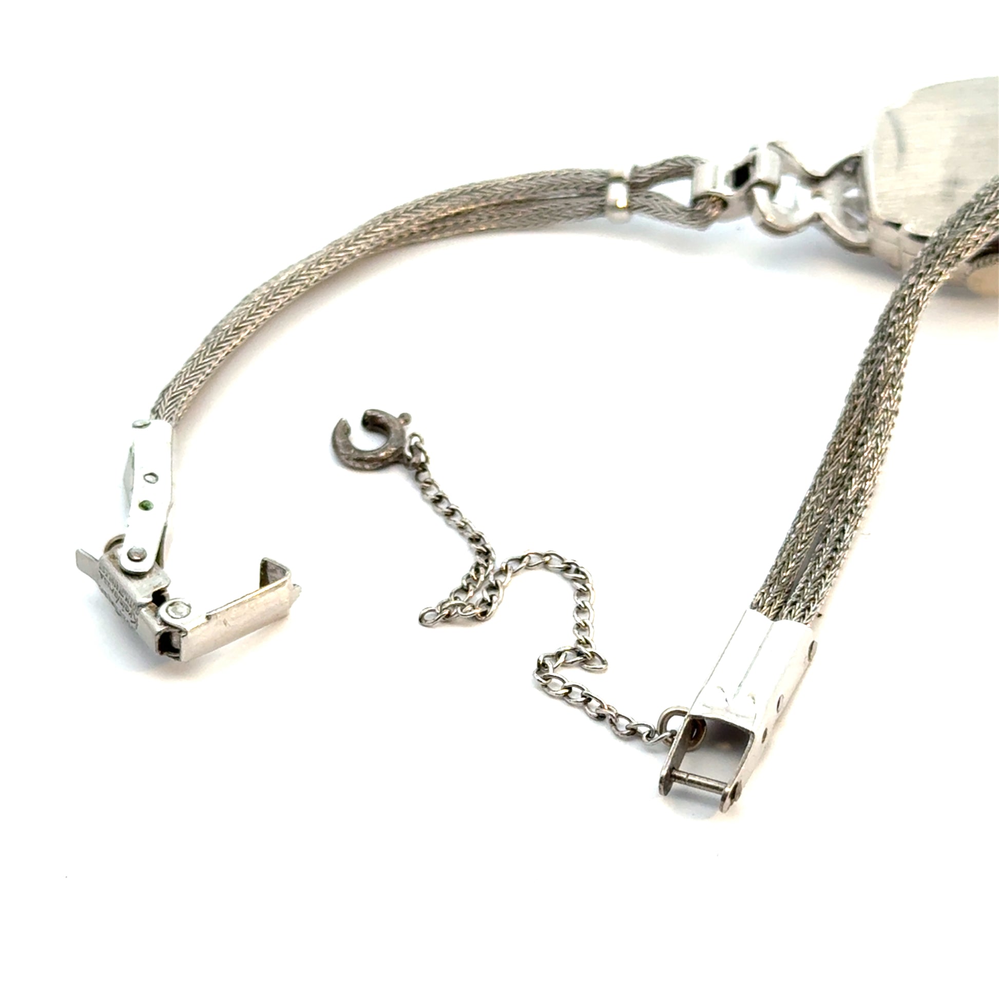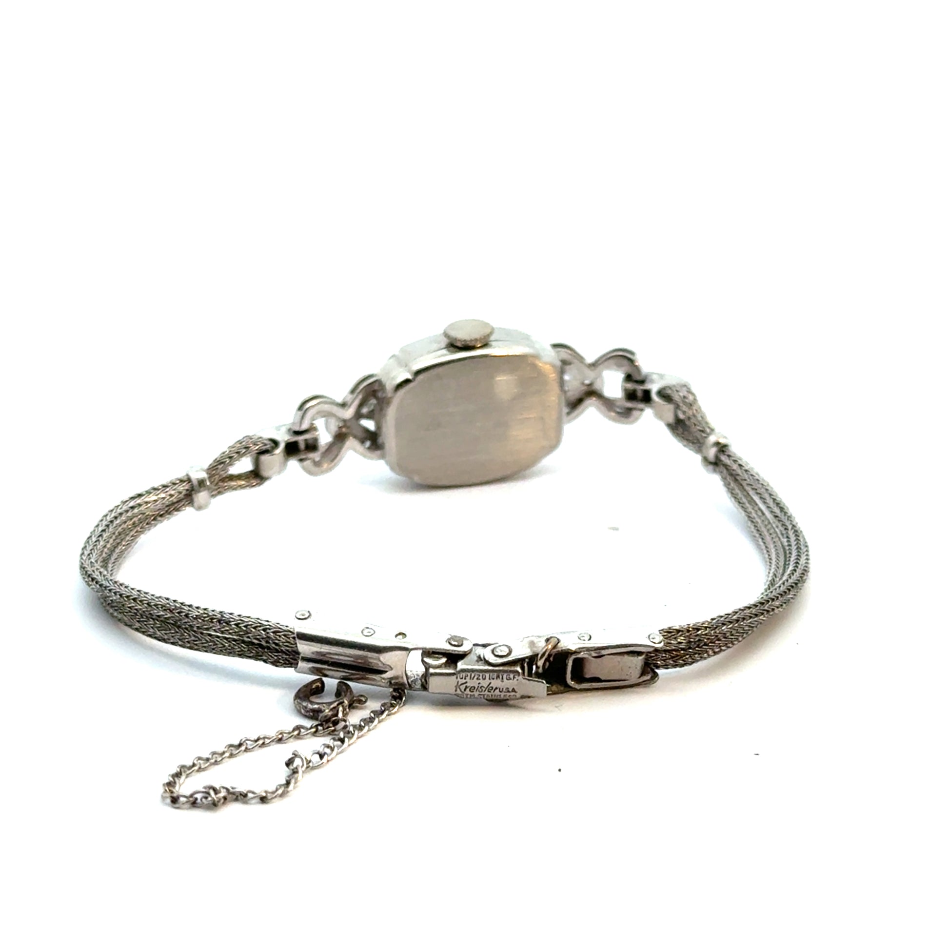 The watch is set with approximately 0.33 carats of sparkling diamonds, arranged around the bezel and within the decorative bow-style motifs at the lugs. Its original vintage dial displays soft patina consistent with age, adding to its authentic antique charm. The bracelet is a fine Kreisler USA woven mesh band with a secure clasp and safety chain.