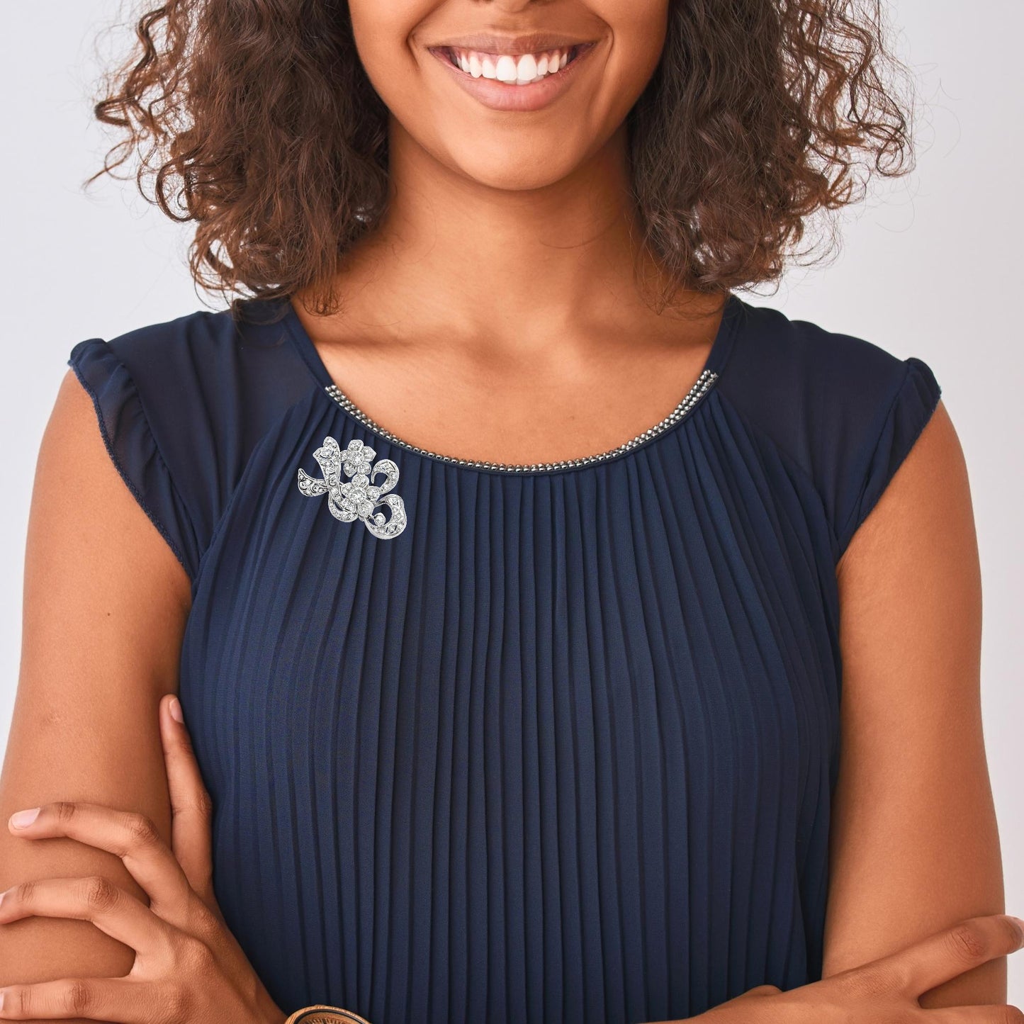 The back view reveals a well-constructed setting with polished platinum, designed to securely hold the diamonds while maintaining the piece’s intricate artistry. This brooch is a timeless accessory, perfect for formal events or as a collector’s item reflecting exquisite craftsmanship.