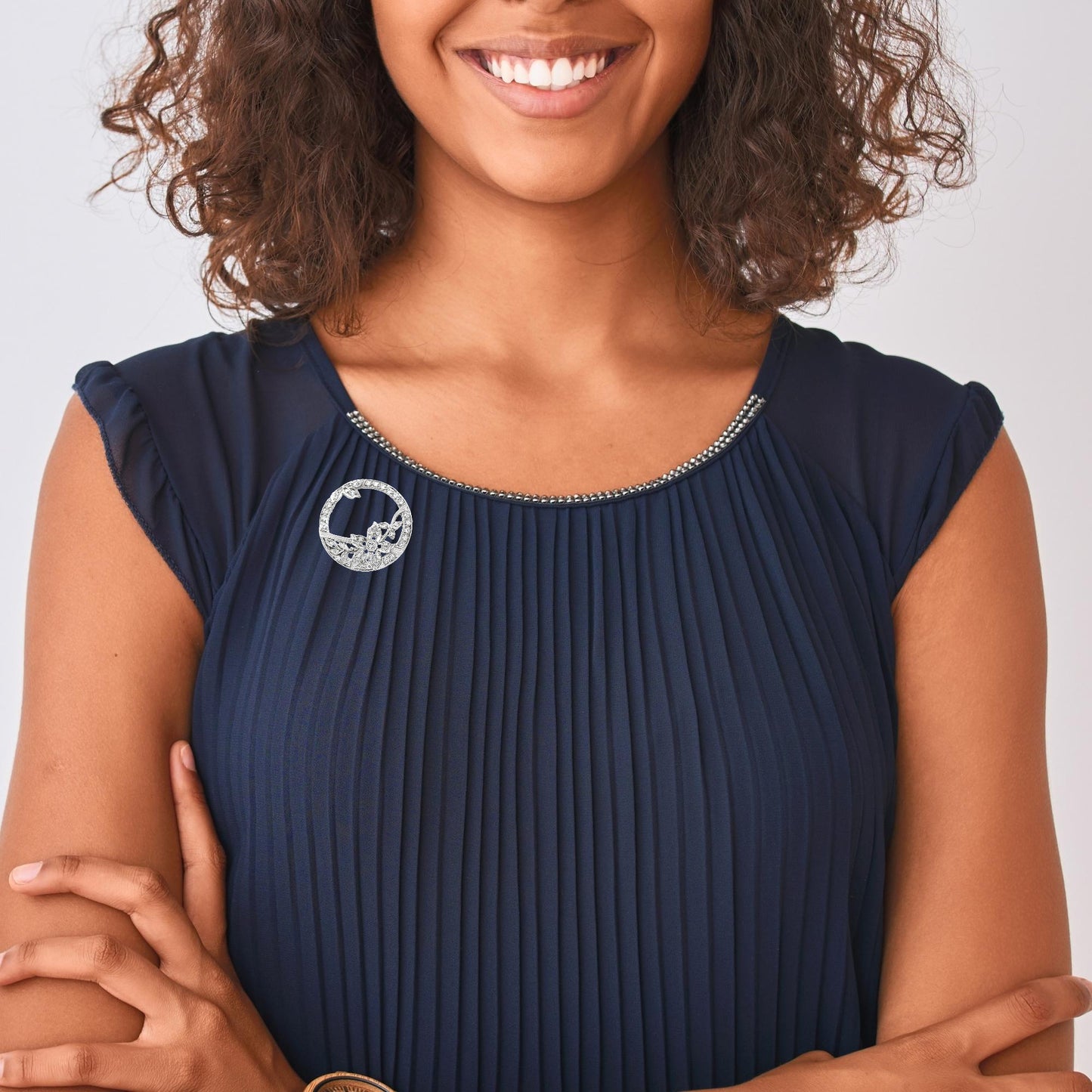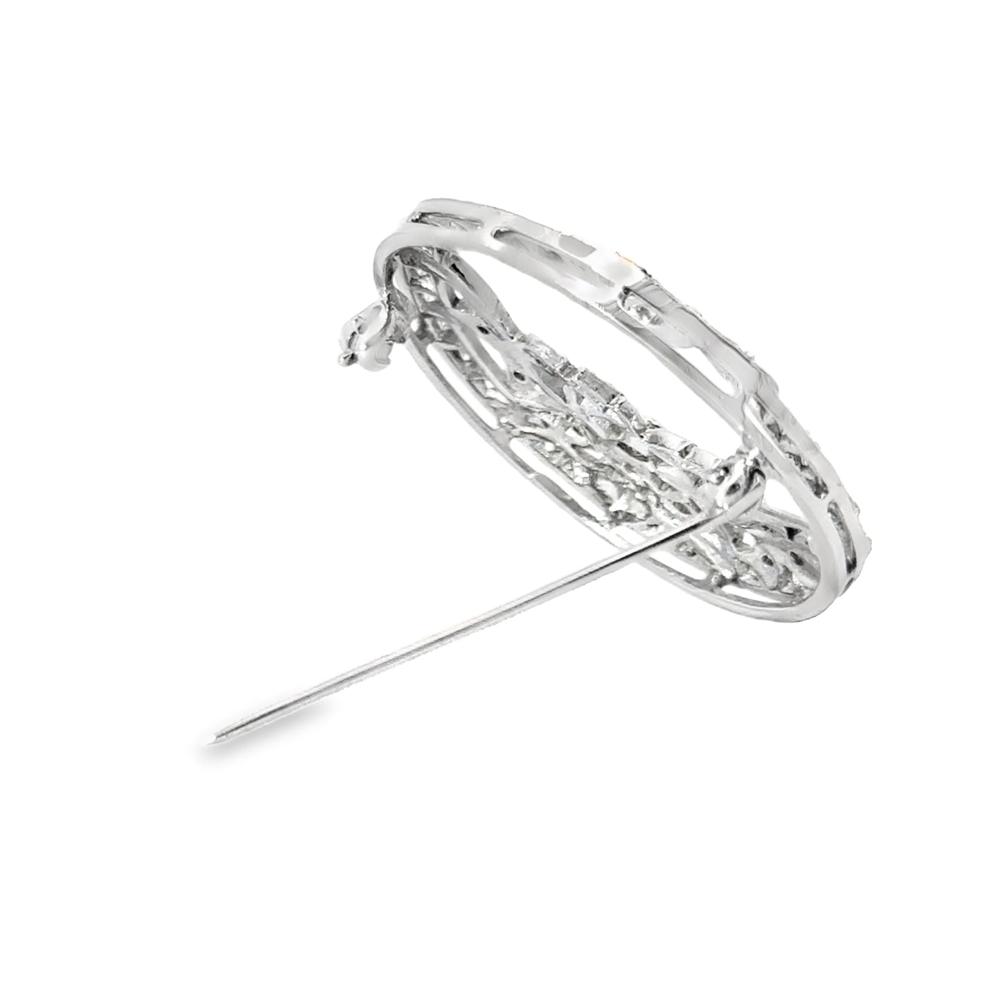 The circular frame is further embellished with diamonds, emphasizing the symmetry and elegance characteristic of the Art Deco era. The platinum setting enhances the brilliance of the diamonds while providing durability and a polished finish. This brooch is a stunning representation of vintage artistry, making it an exquisite piece for formal wear or as a cherished heirloom.
