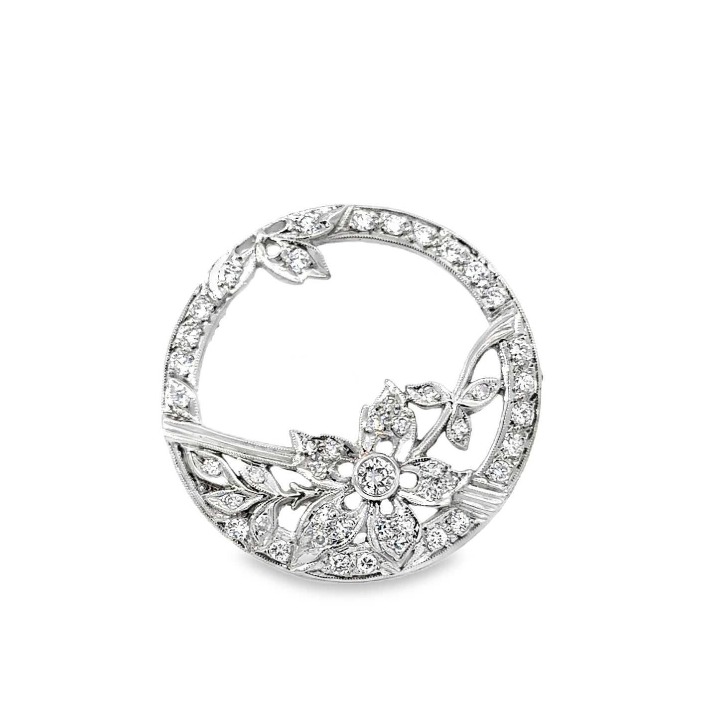 This is an elegant platinum brooch from the 1920s, showcasing a timeless circular design adorned with diamonds. The brooch features an intricate floral motif with a central flower accented by a round-cut diamond as its focal point. Surrounding the flower are delicately crafted leaves and vines, all adorned with smaller pavé-set diamonds, creating a harmonious and sparkling composition.
