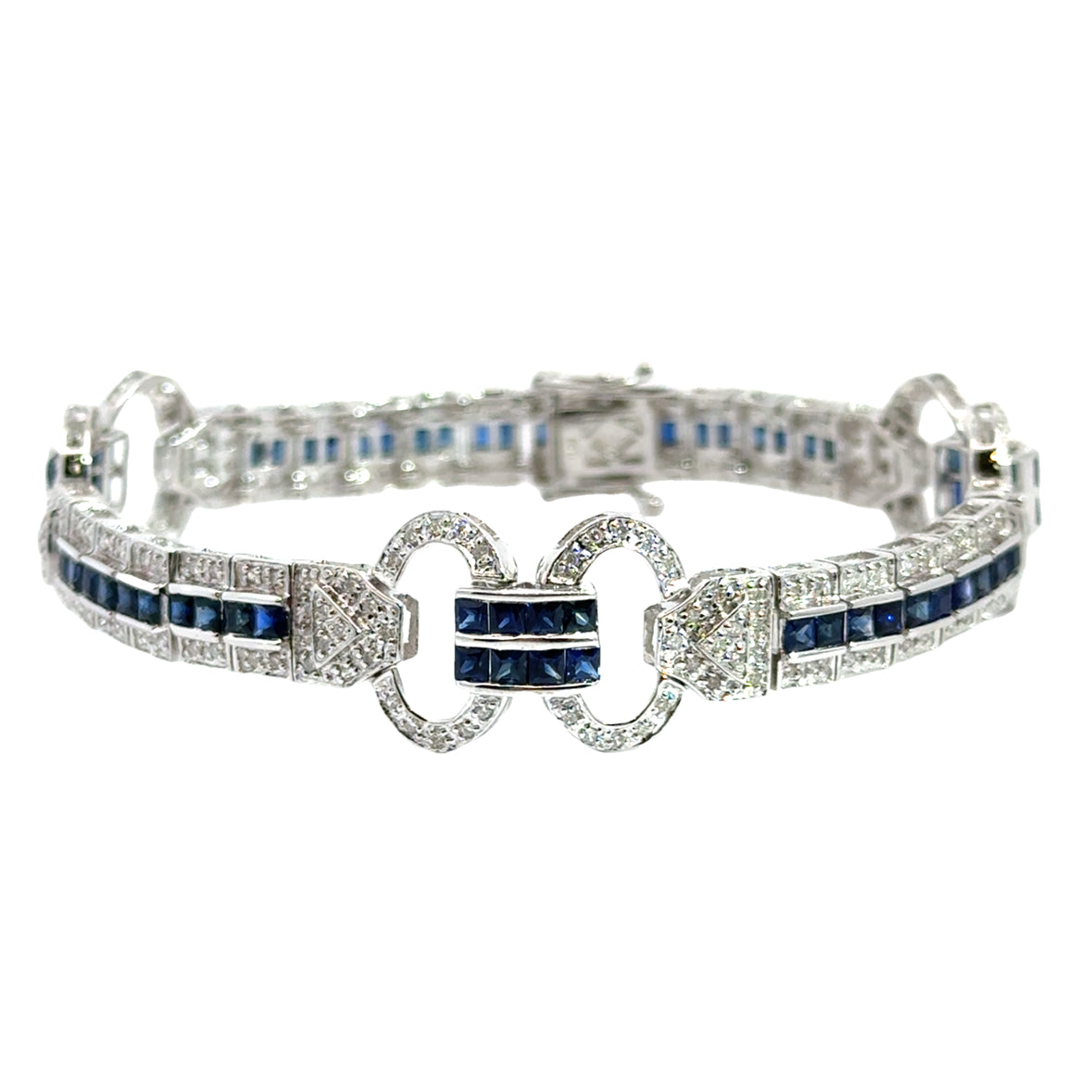 This exquisite 14k white gold bracelet is a dazzling showcase of elegance and sophistication, featuring a stunning combination of deep blue sapphires and brilliant diamonds. The bracelet’s intricate design is composed of channel-set, square-cut sapphires that create a seamless, luxurious ribbon of color, enhanced by sparkling pave-set diamonds.