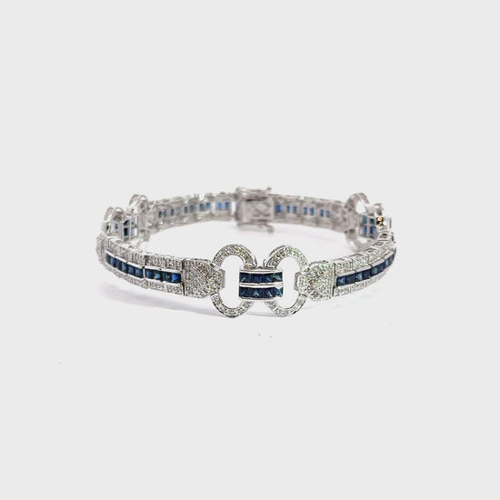 At the center, interlocking loops encrusted with diamonds add a dynamic and sophisticated element, lending an Art Deco-inspired flair to the design. The contrast between the vivid blue sapphires and the brilliant white diamonds creates a timeless, refined aesthetic.
