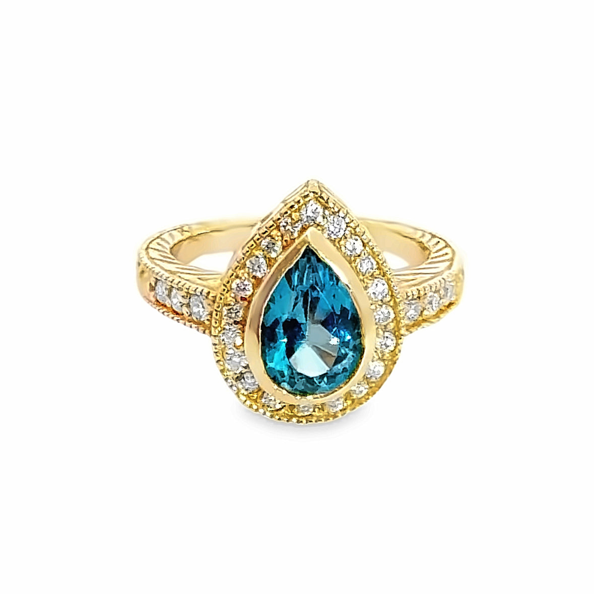 Beautiful teardrop shape blue tourmaline ring that has lovely clarity and color, and is complemented by a halo of sparkling diamonds set in lustrous rose gold.