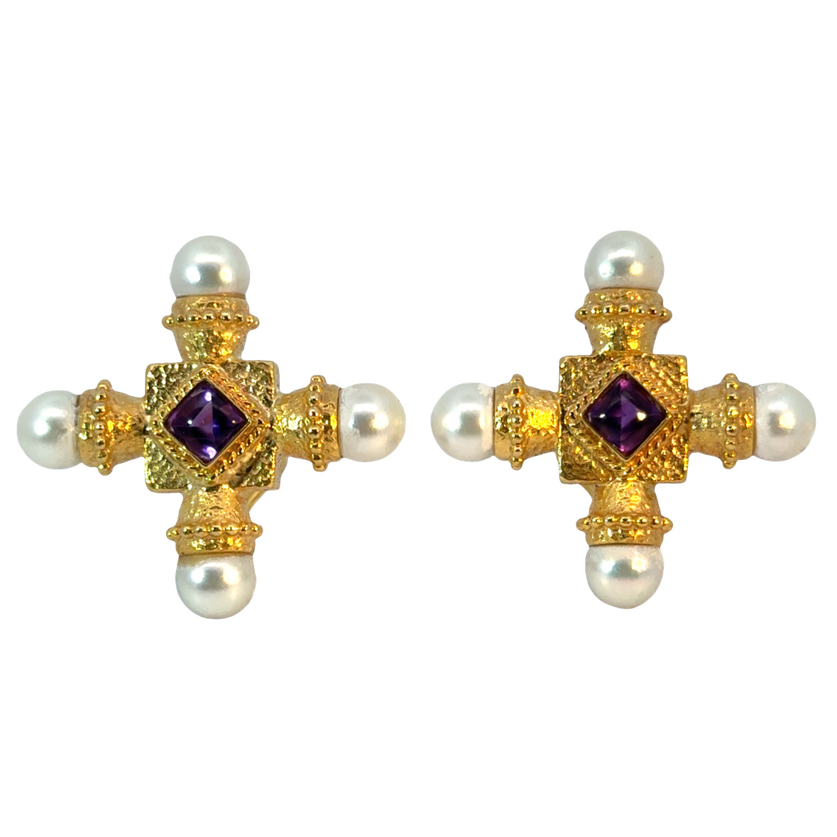 18K Yellow Gold Amethyst & Pearl Cross Earrings – French Clip