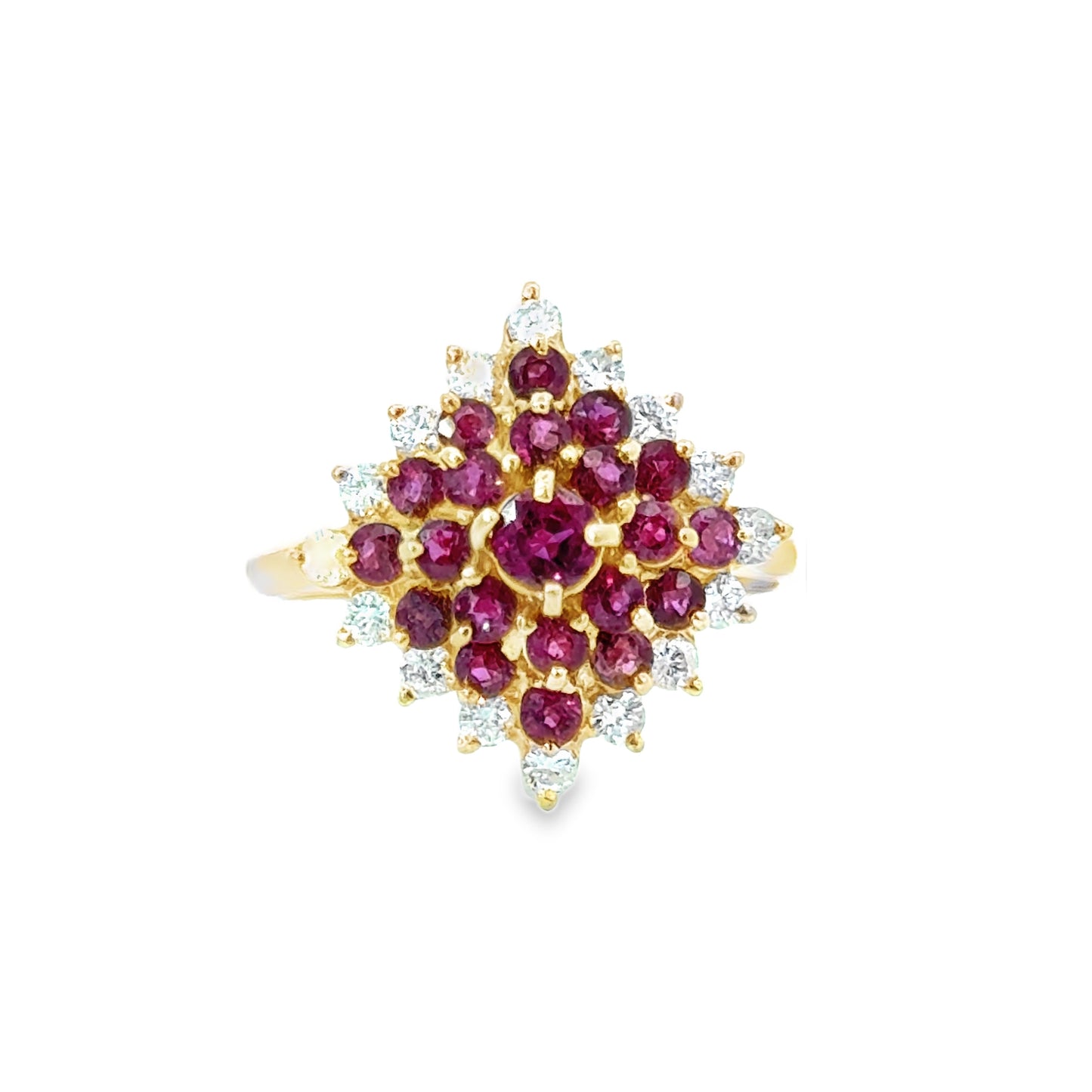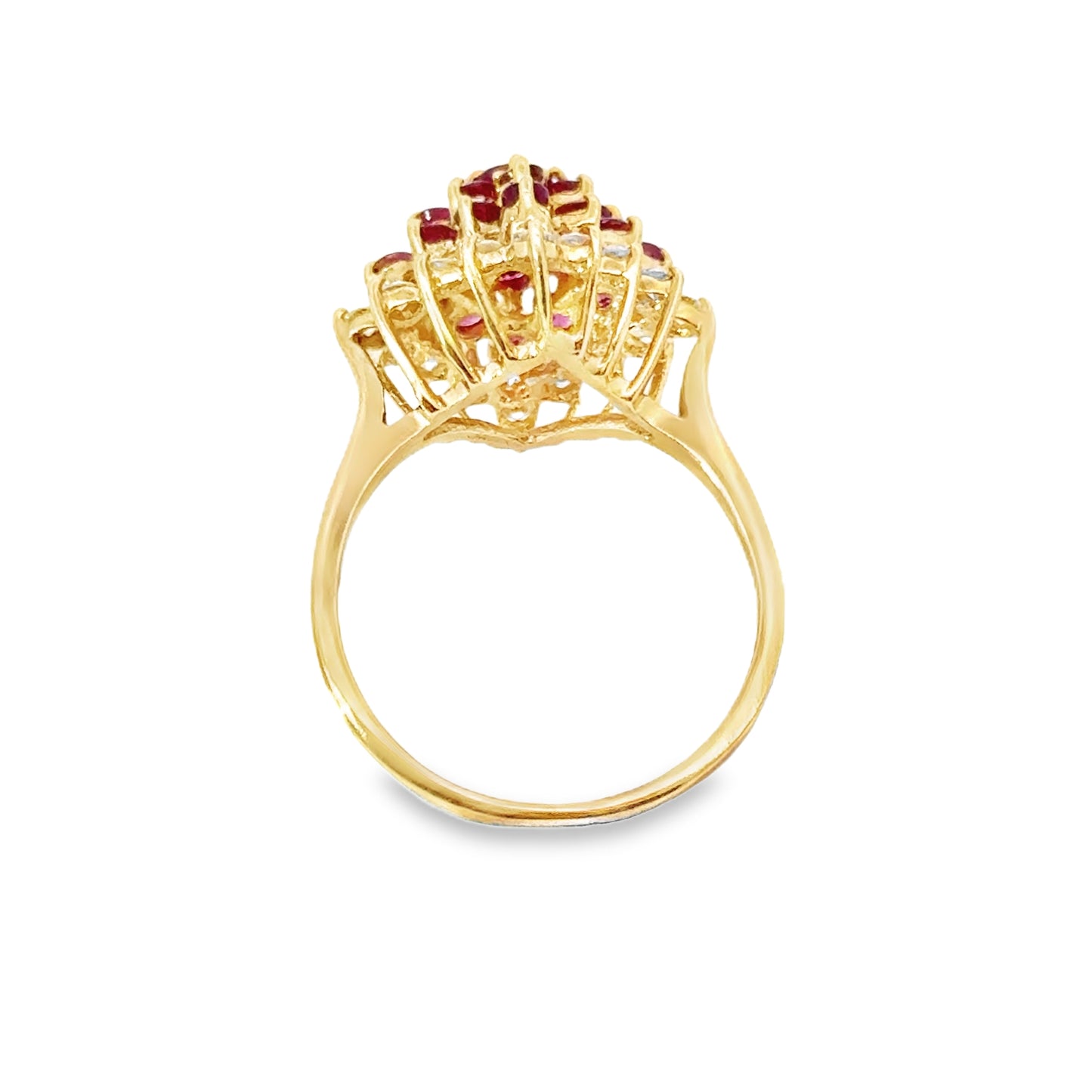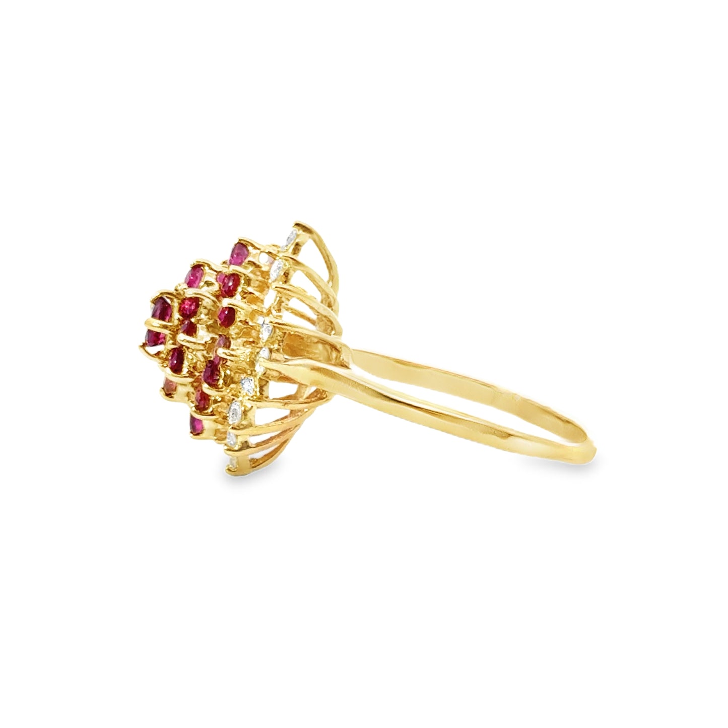 Luxurious 14K yellow gold ring with a domed design that features an impressive cluster of rubies and diamonds. The rubies are set closely together in a floral or starburst pattern, creating a rich red focal point that stands out dramatically. Surrounding the rubies are sparkling diamonds that add brilliance and enhance the overall allure of the piece. The combination of the deep red rubies with the bright diamonds and the warm yellow gold gives the ring a regal and opulent look. This statement piece is perfect for those seeking a bold, eye-catching accessory with vintage elegance.