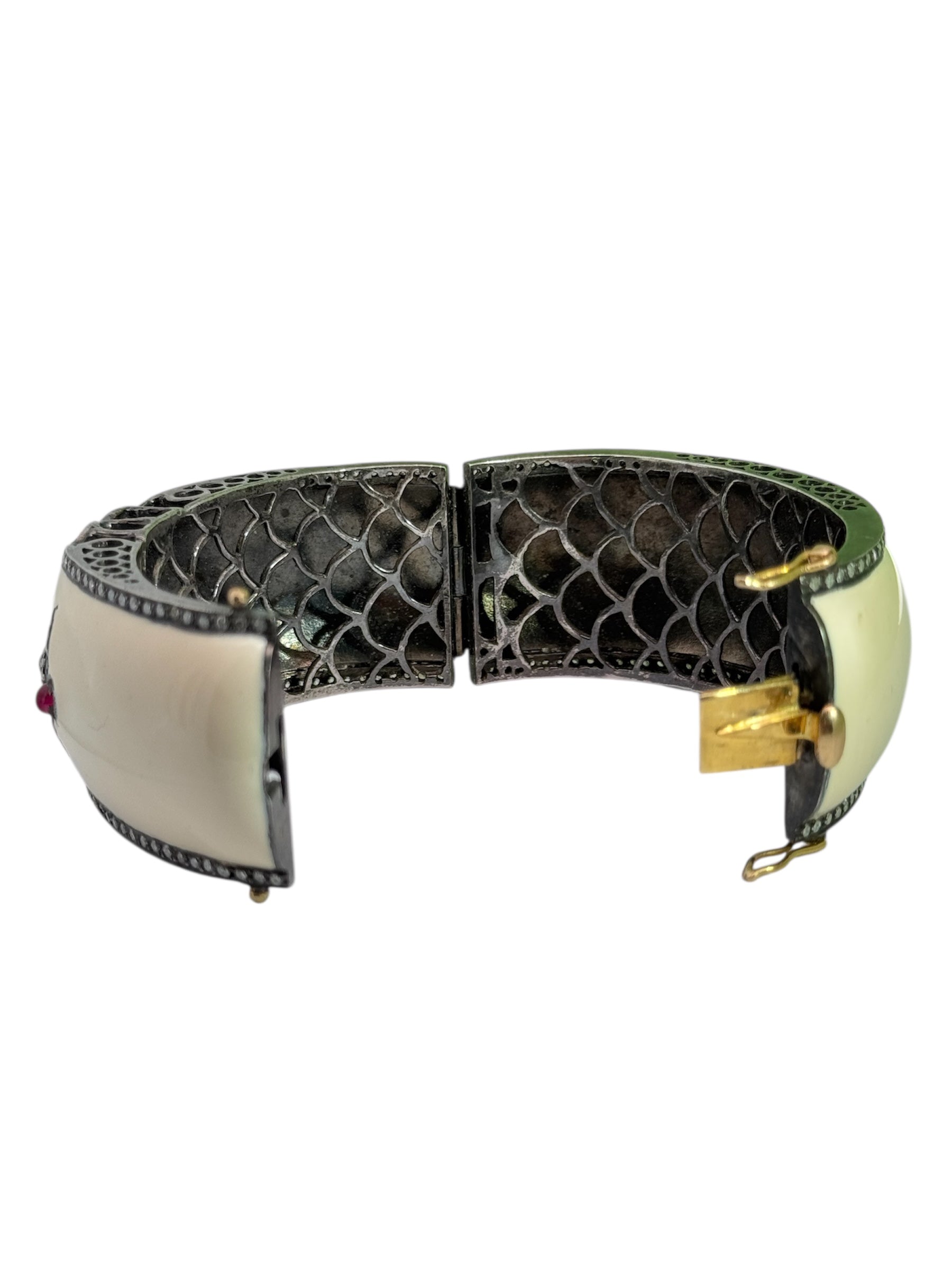 An extraordinary vintage bangle bracelet showcasing refined craftsmanship and striking design. Crafted in sterling silver with warm 14K yellow gold accents, this substantial bracelet features smooth ivory-toned enamel panels beautifully contrasted by elaborate blackened silver scrollwork. At the center, a vivid aquamarine is framed by sparkling diamonds, with rich ruby cabochon accents adding depth and color. The interior reveals intricate openwork, reflecting the high level of artistry throughout.