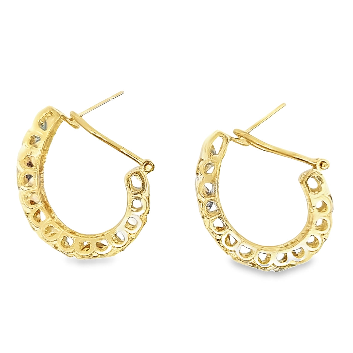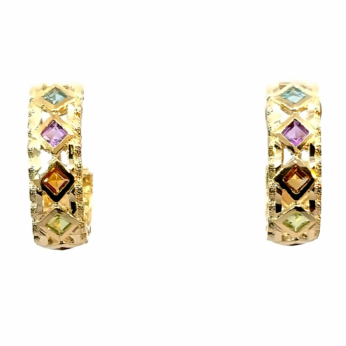 Experience elegance with a splash of color. These exquisite hoop earrings feature an array of radiant gemstones set in luxurious textured and polished yellow gold. No detail was omitted, and even from the side you can see lovely lacy details. Perfect for any occasion when you want a classic earring with a twist and a touch of color.