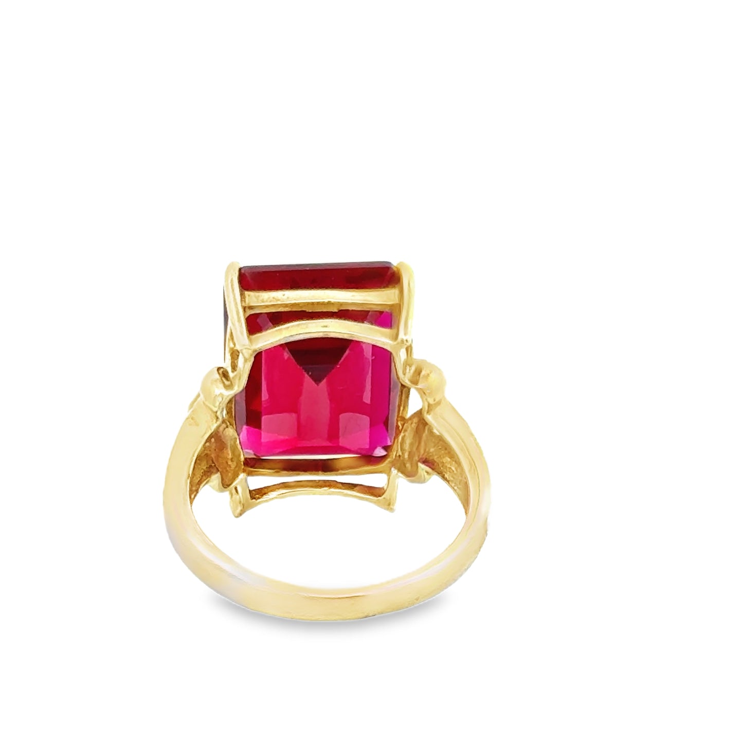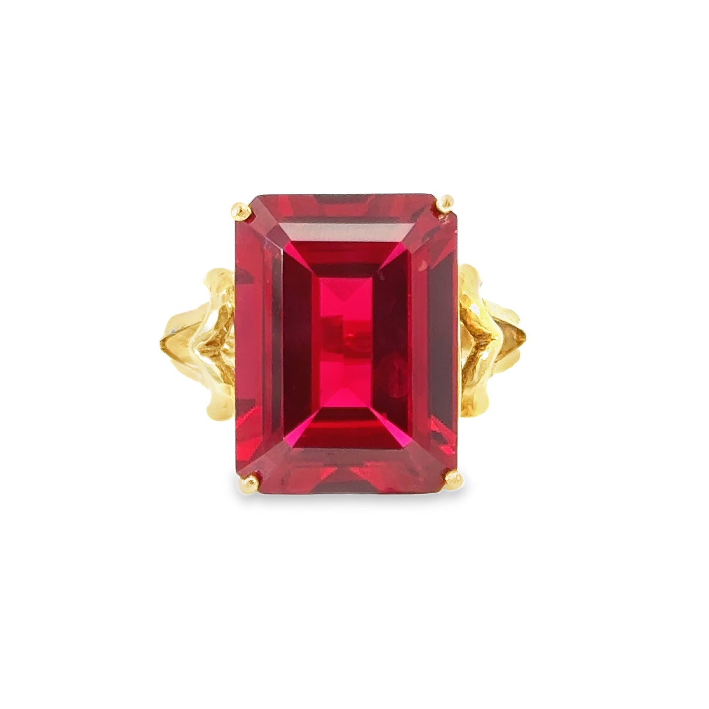 This bold and striking ring features a deep red quartz stone set in yellow gold. The quartz is cut in an impressive emerald shape, giving it a sophisticated and regal appearance. Its rich, intense red color draws immediate attention and creates a dramatic focal point. The gold setting adds warmth and complements the deep hue of the quartz beautifully.