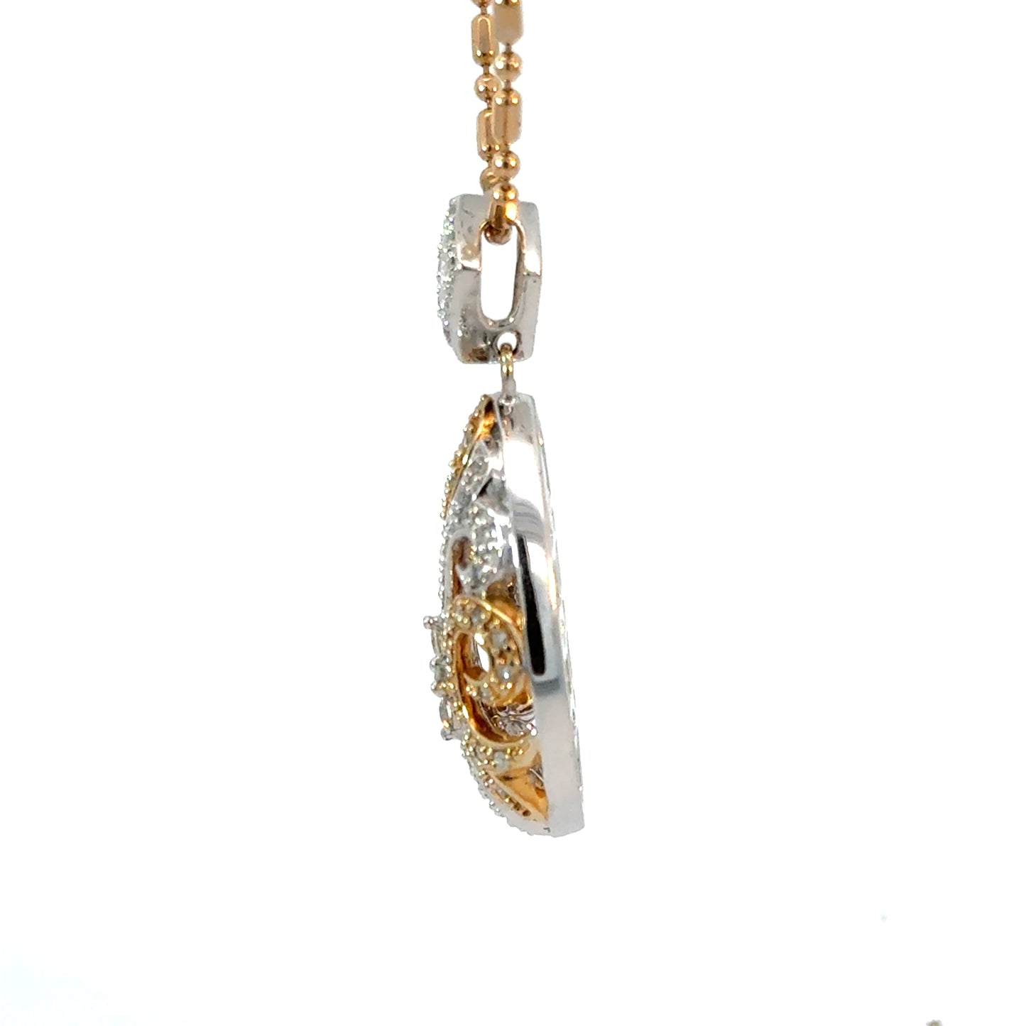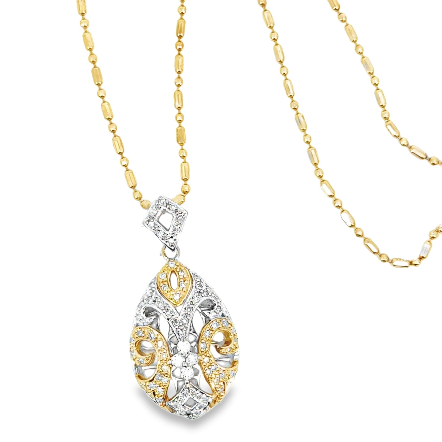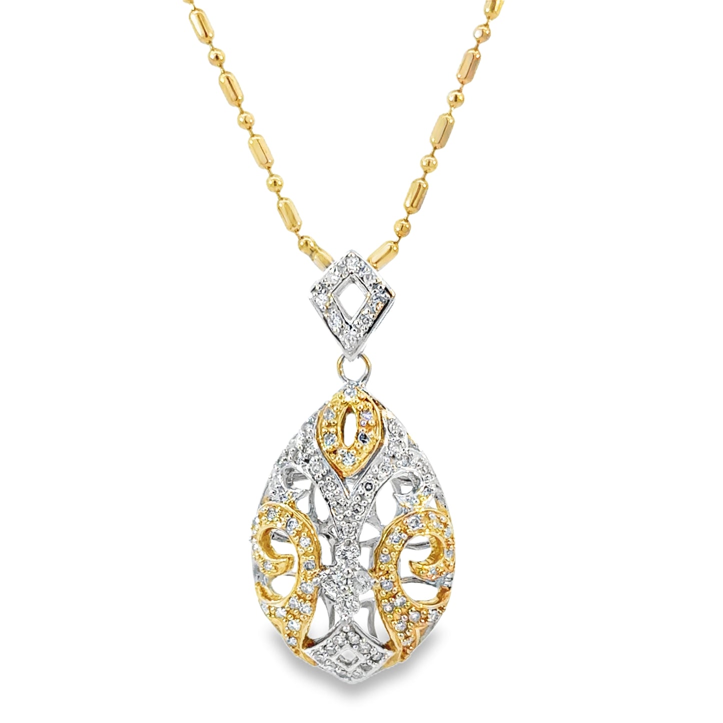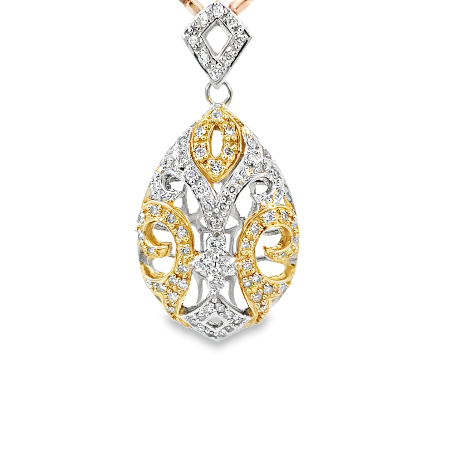Sophisticated 18K two-tone pendant necklace crafted from both yellow and white gold and embellished with diamonds. The pendant features a teardrop shape with intricate filigree work, combining white gold and yellow gold accents that create a dynamic and elegant design. The gold sections are adorned with numerous small, round-cut diamonds, which add a sparkling brilliance. The yellow gold scroll patterns bring a warm contrast and a touch of vintage elegance.