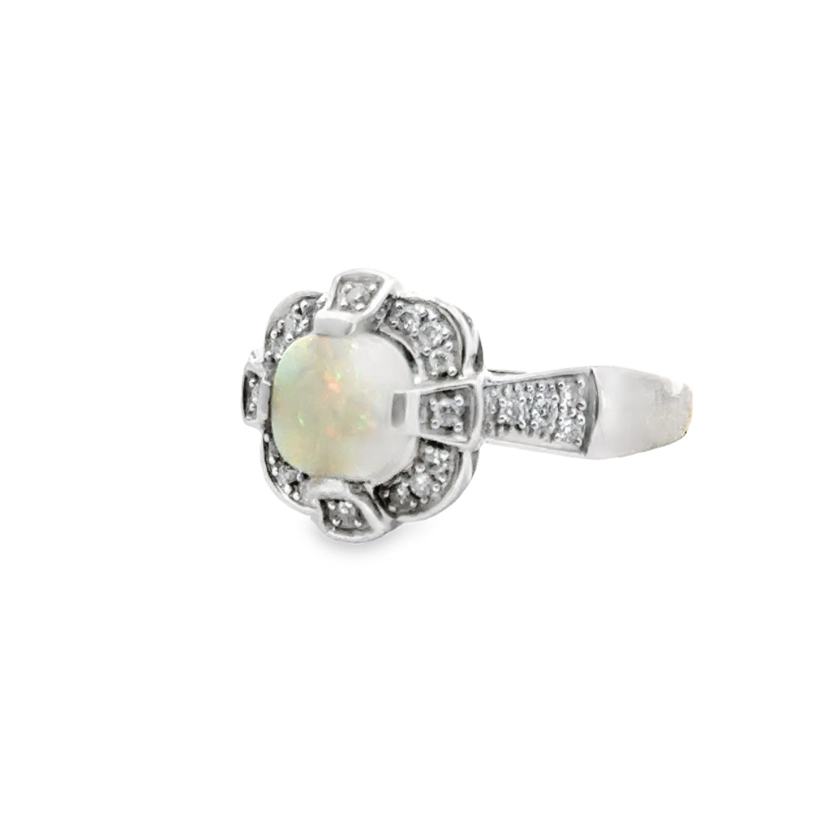 Experience the charm of yesteryear with this beautiful estate vintage ring, featuring a mesmerizing opal centerpiece set in delicate white gold design, accented by sparkly diamonds. This ring is perfect for any occasion and any age.