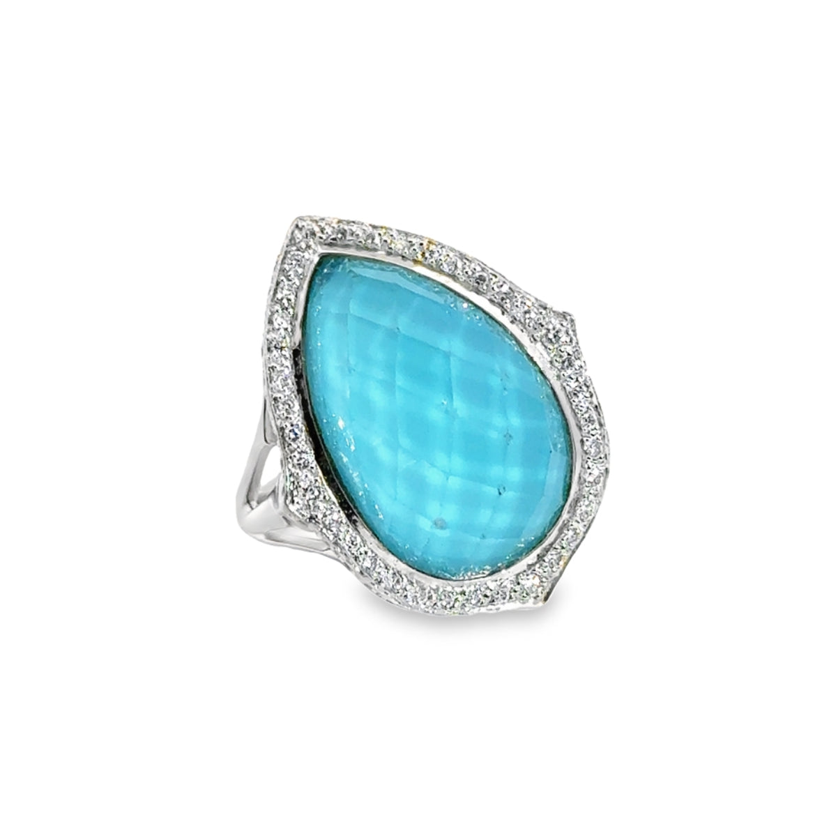 An exciting Stephen Webster showstopper with it's unique band design reminiscent of an electric flash and a diamond accent at the bottom of the band. At the heart of this ring is a mesmerizing large pear-cut aquamarine stone that is sparkly and reflective, set in 18K white gold and accented by pave diamonds for the ultimate show-stopping effect. This mesmerizing cocktail ring exudes elegance and captivates every gaze with its electric flash band.