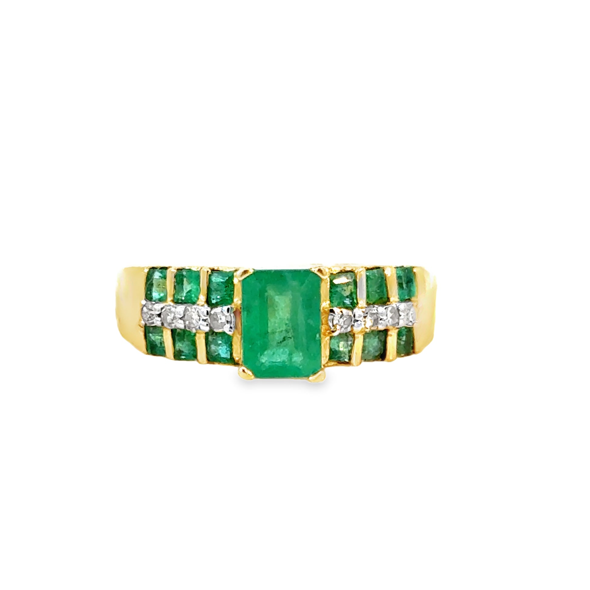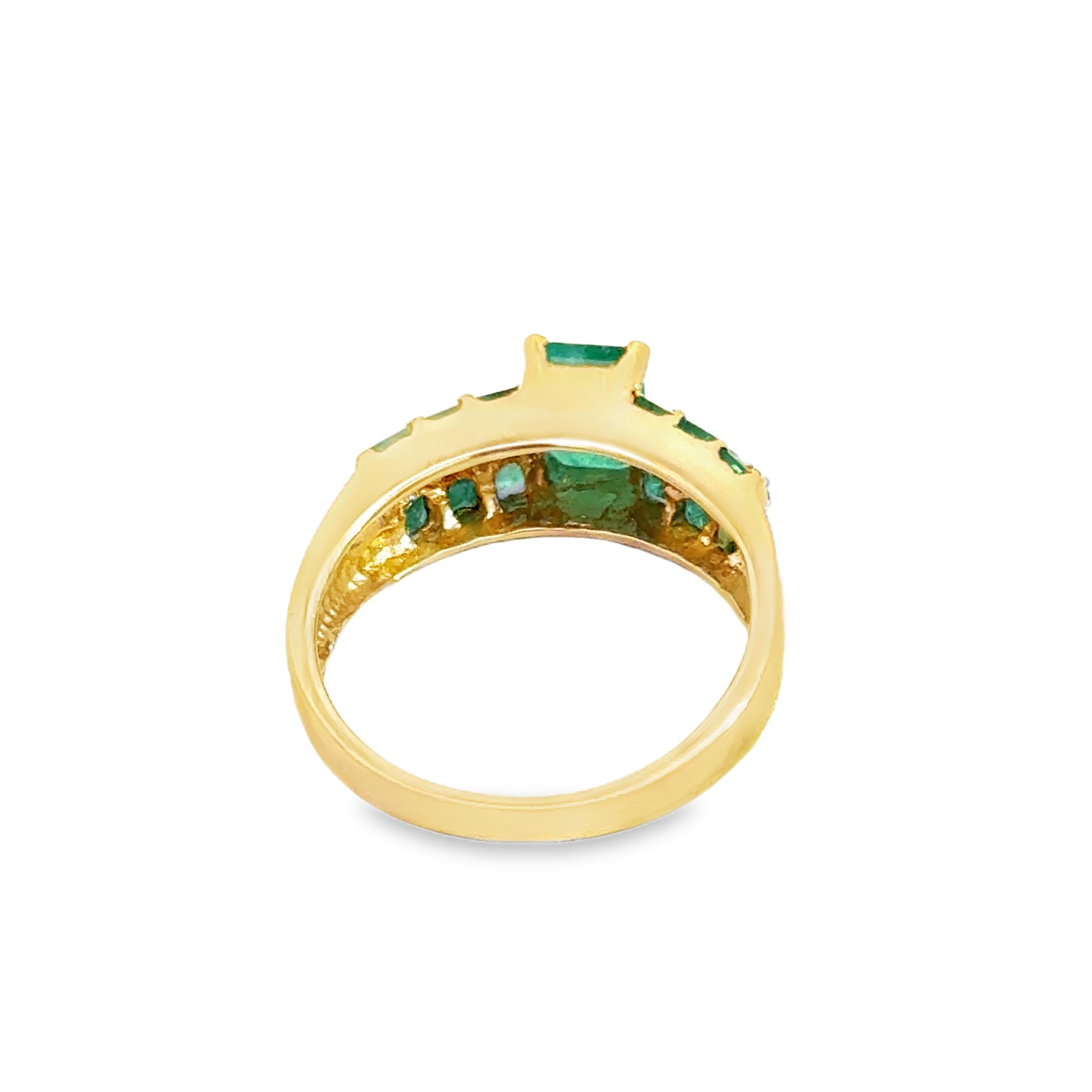 Vibrant and refined, this ring features a sleek band design centered with a richly colored emerald-cut emerald, flanked by channel-set emeralds and accented with a row of brilliant round diamonds. The carefully arranged gems—totaling approximately 1.35 carats of emeralds and 0.16 carats of diamonds—create a balanced composition that glimmers from every angle. Expertly crafted in solid 14K yellow gold, the design tapers gently for a comfortable, elegant fit.
